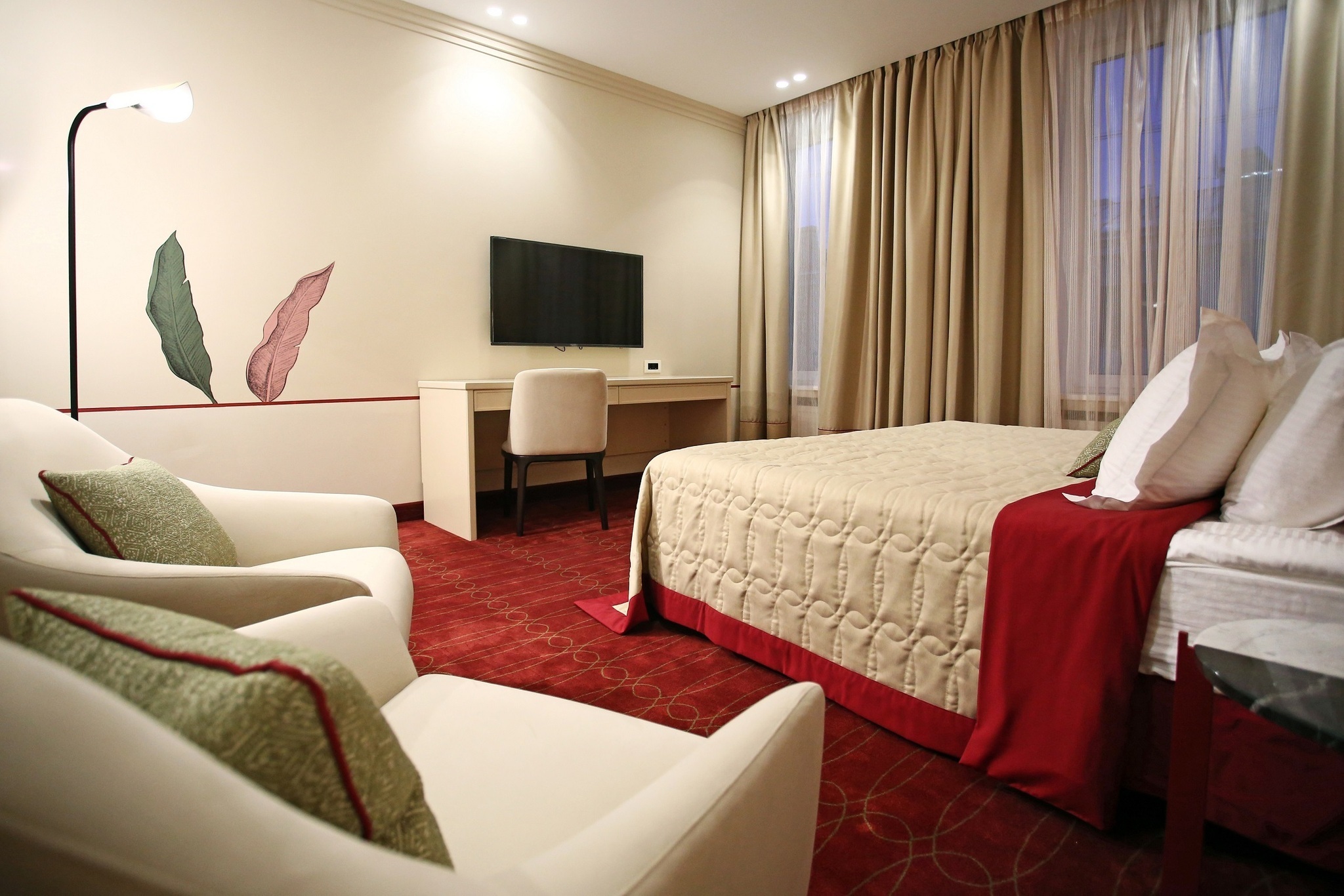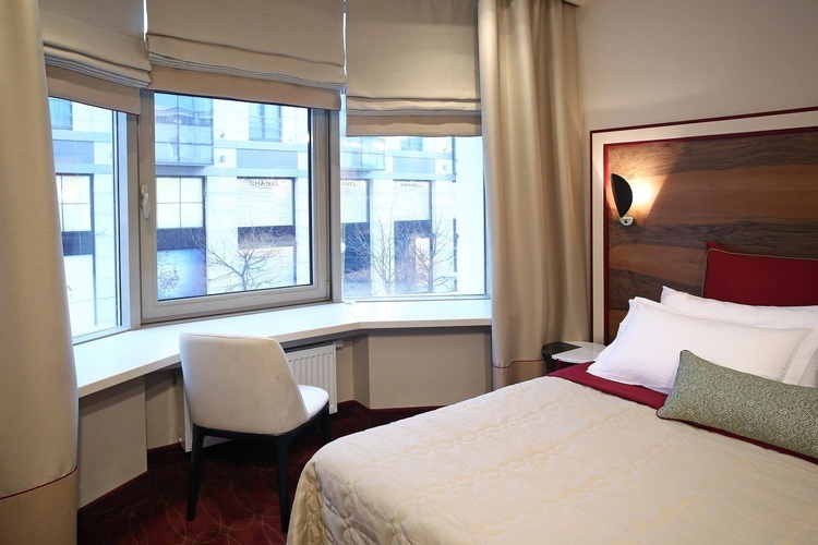 Просторный номер, окна которого выходят в спокойный внутренний дворик отеля. Номера данной категории располагают большой двуспальной кроватью. В номере имеется система кондиционирования, большой письменный стол и USB розетки у кровати. Отделка изголовья натуральным деревом придает уют и теплоту, а шторы "блекаут" позволяют отлично выспаться даже в период "белых ночей".