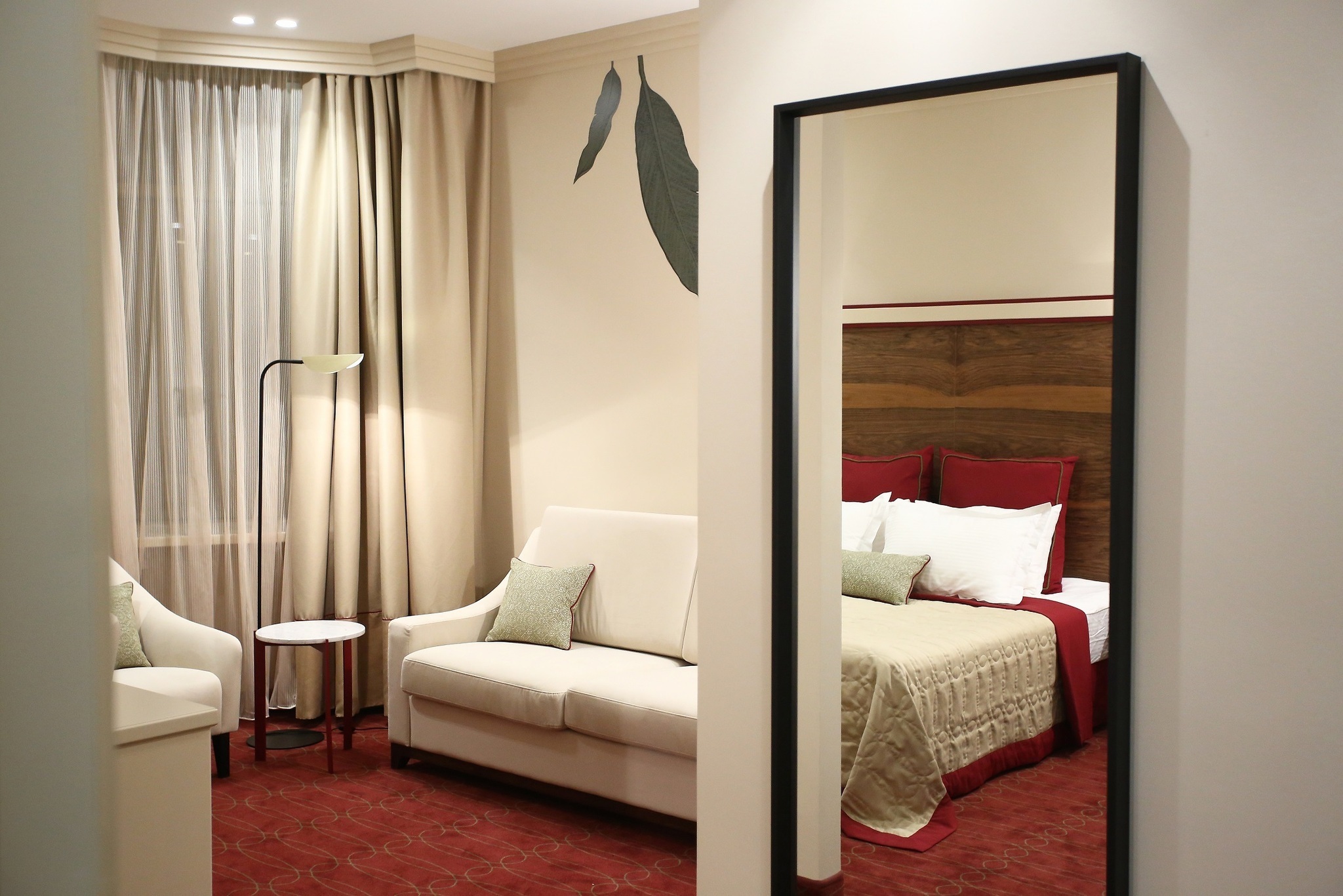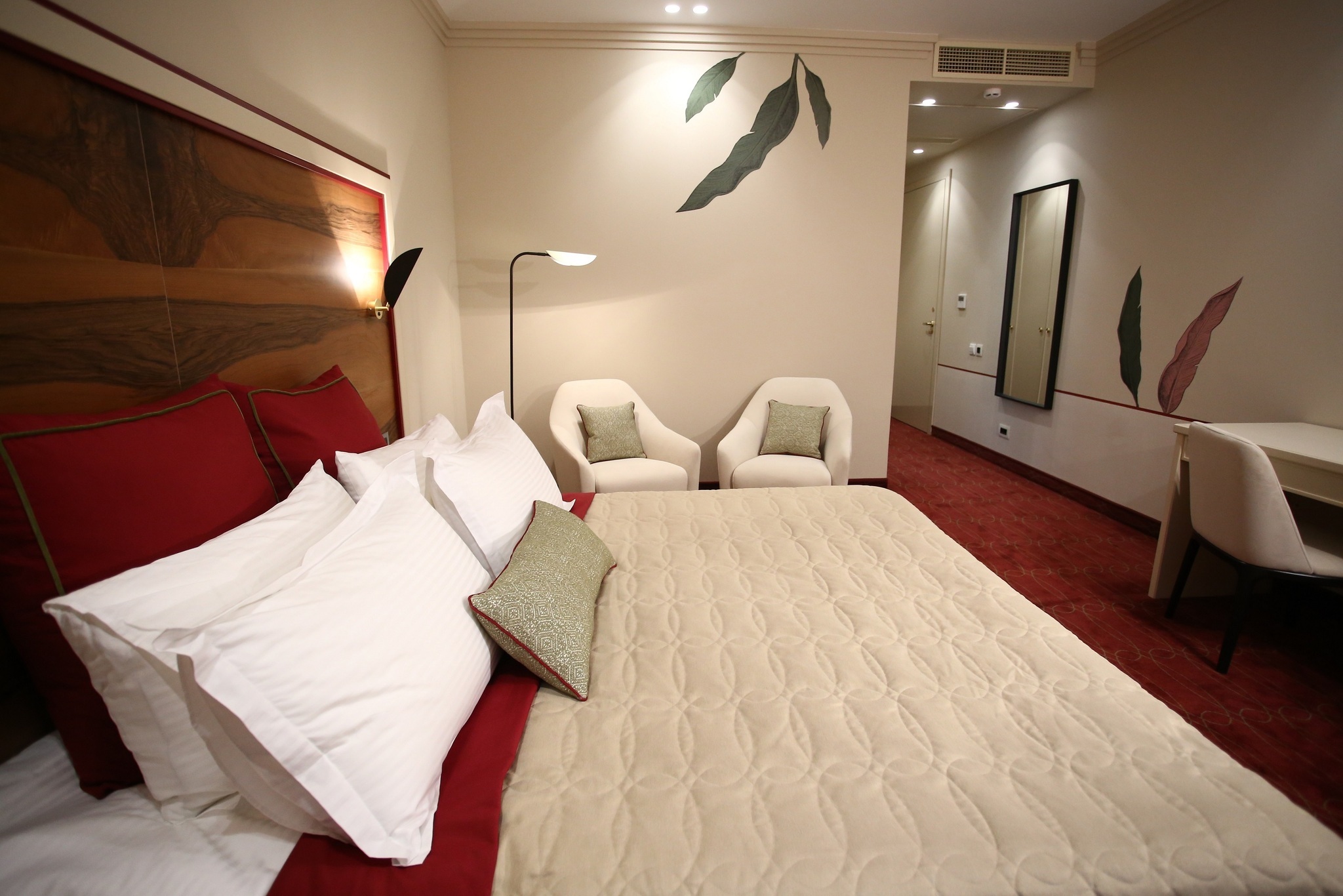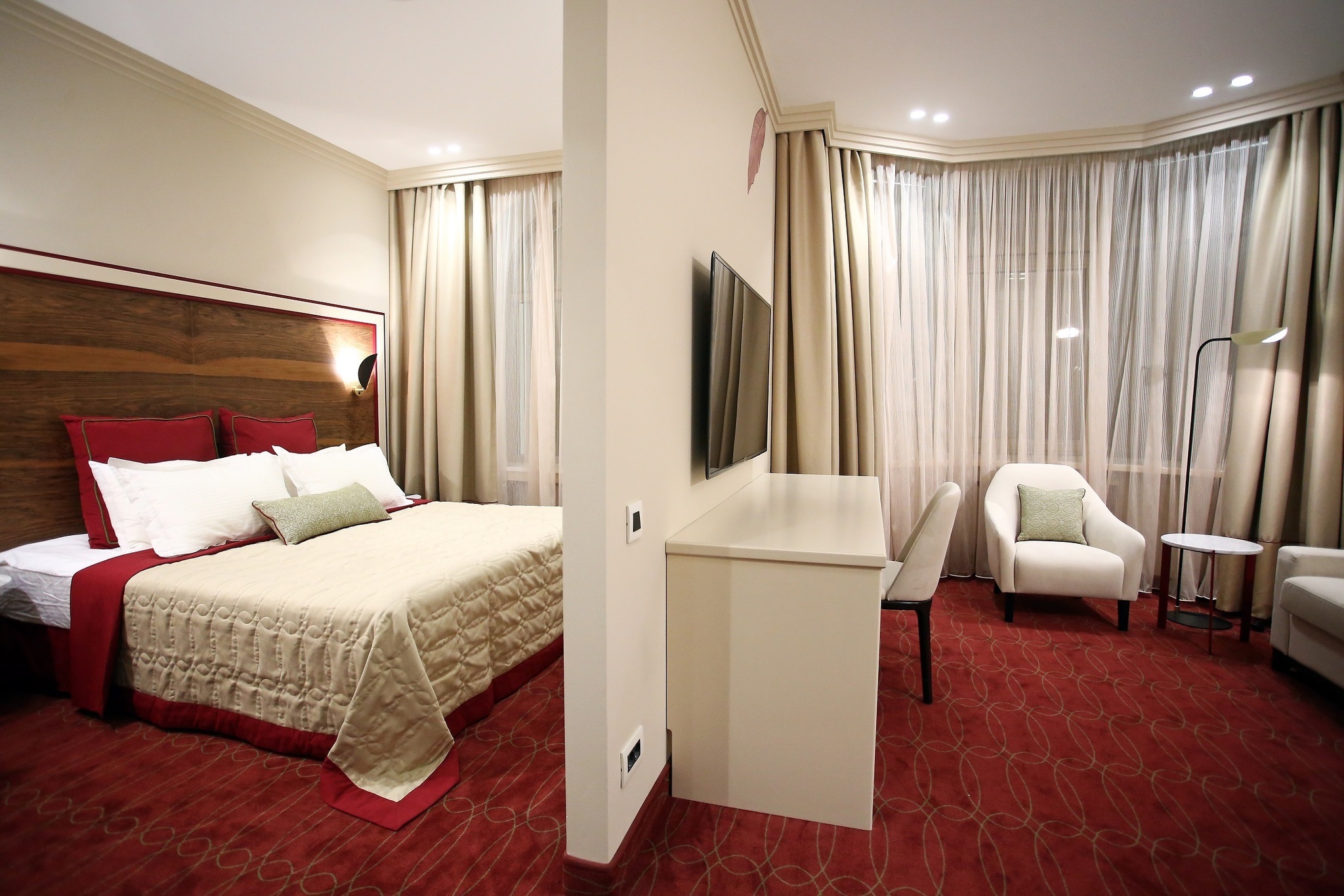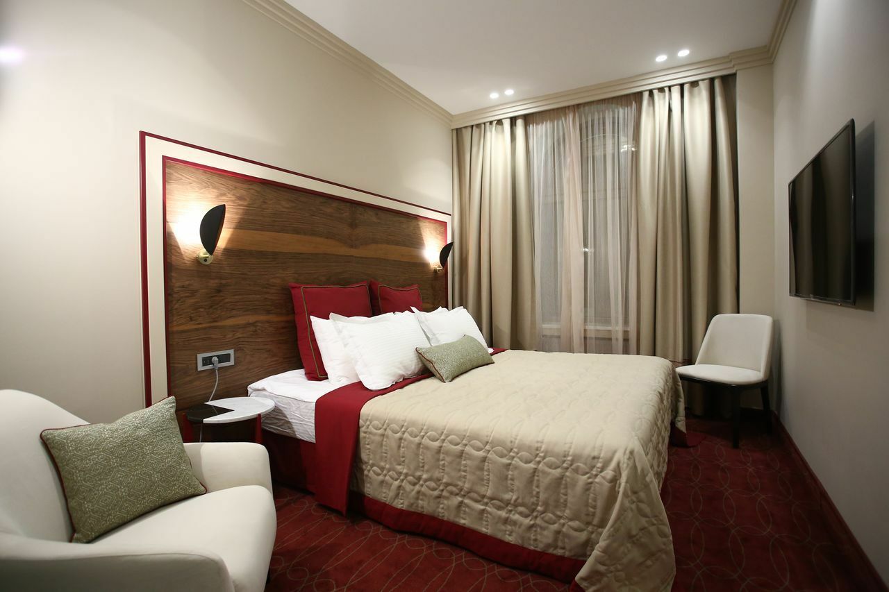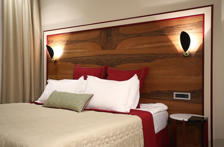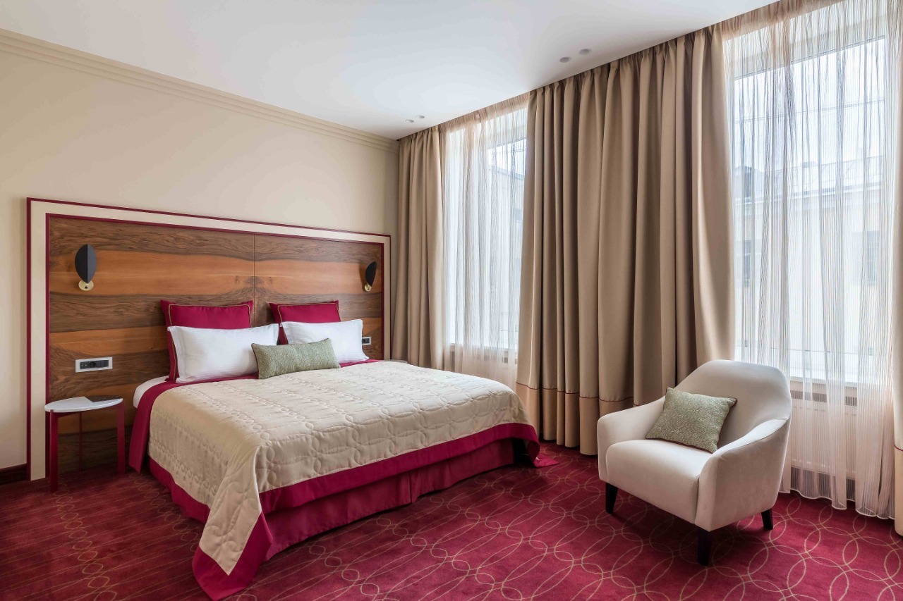 Номер разделен на 2 зоны, что придает ощущение открытого, но в то же время уютного пространства. Окна выходят в тихий внутренний дворик отеля. Номера данной категории располагают большой двуспальной кроватью и просторной ванной комнатой с подогреваемым полом. Система кондиционирования, 4 USB розетки у изголовья кровати, большой письменный стол и минеральная вода в душе. Изголовье кровати отделана натуральным деревом, а ванная комната мрамором. В номерах данной категории все продумано до мелочей.