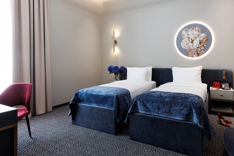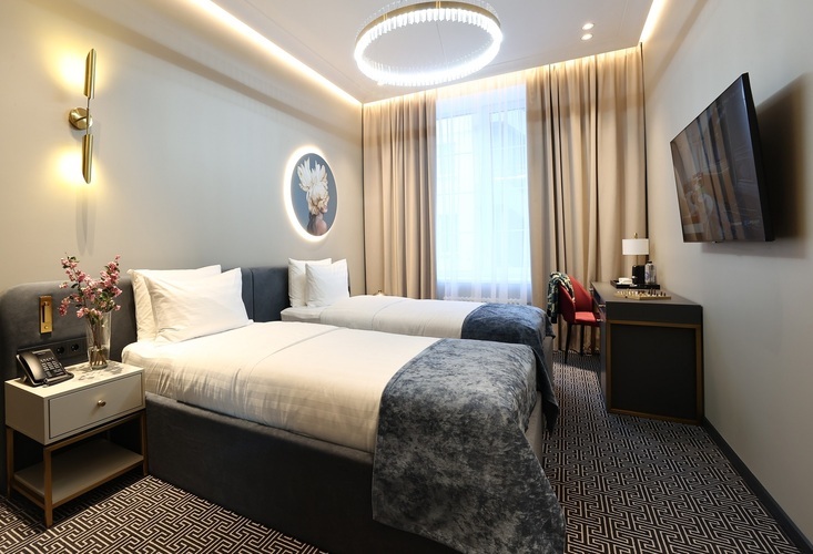 Просторные однокомнатные номера повышенной комфортности от 26 кв. м с несколькими большими окнами. Установлены 2 раздельные кровати, которые по запросу гостей сдвигаются вместе. Обустроен гостиный уголок с диванчиком и/или креслами. Вид из окон на оживленную Большую Морскую и/или Гороховую улицу или во внутренний двор