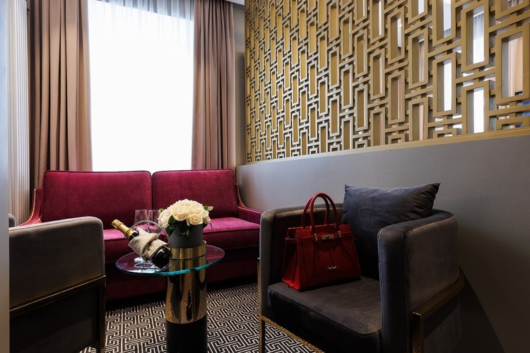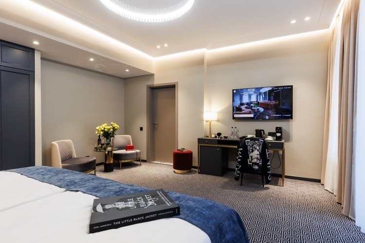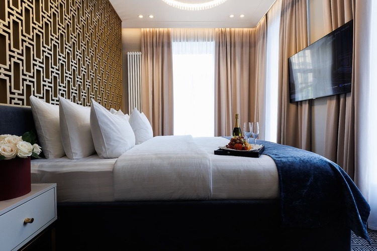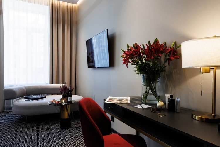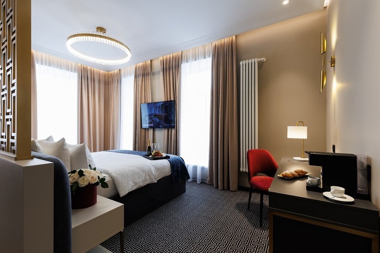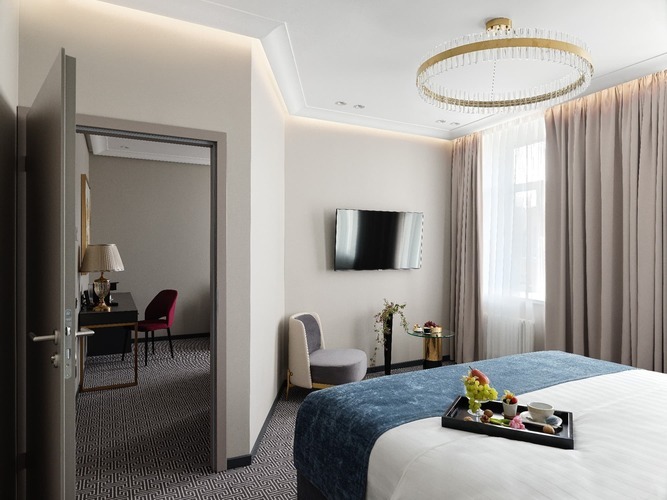 Двухкомнатные номера категории Люкс (около 38 кв. м.) состоят из гостиной с декоративным камином и спальни. В спальне стоит кровать размера «king-size» (установка 2 отдельных кроватей не предусмотрена), а в гостиной – двуспальный раскладывающийся диван. К услугам гостей капсульная кофемашина и вечерний сервис. Из окон открывается вид на оживленную Большую Морскую улицу.