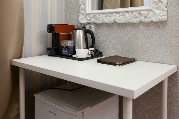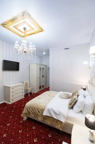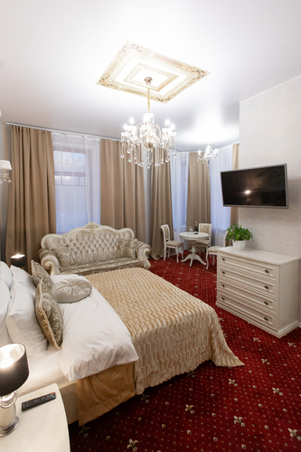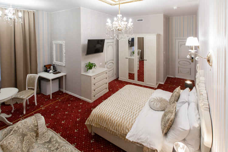 Площадь номера - 30 кв. м, вместимость – 2 человека. Номер оснащен уютной зоной отдыха и рабочим местом, большими окнами с великолепным видом на Каменностровский проспект. В номере: двуспальная кровать (King size), высокий ортопедический матрас, комфортабельная мебель, ШКАФ ДЛЯ ХРАНЕНИЯ ОДЕЖДЫ рабочий стол, плазменный телевизор, многоканальный телефон, wi-fi, кондиционер, сейф, мини-бар, кофе-машина с капсулами, чайник и ассортимент чая, утюг и гладильная доска. Роскошные хрустальные люстры ук