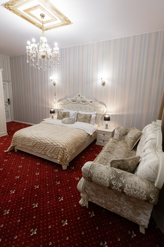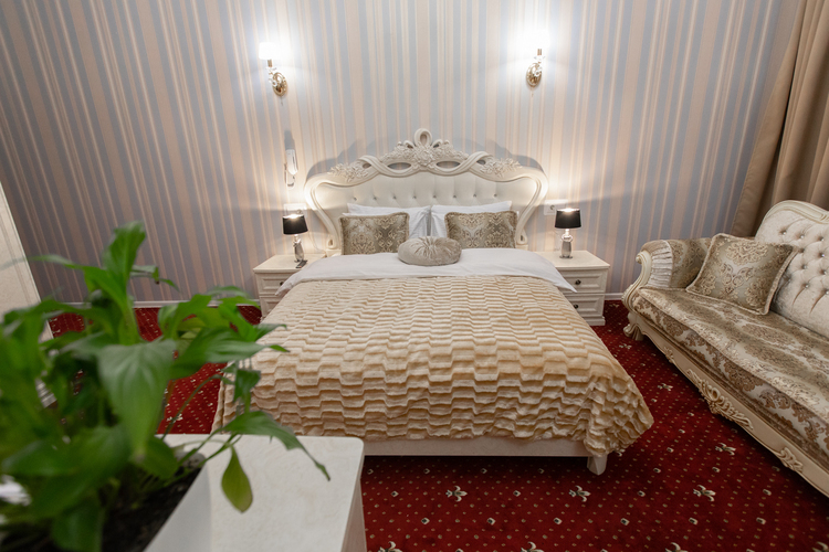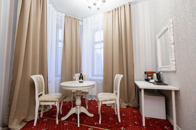 Площадь номера - 35 кв. м, вместимость – 2-3 человека. Номер оснащен уютной зоной отдыха и рабочим местом, большими окнами с великолепным видом на Каменностровский проспект. В номере: двуспальная кровать (King size) с высоким ортопедическим матрасом, комфортабельная мягкая, выполненная в стиле Барокко мебель, уютные кресла и стол. Плазменный телевизор, многоканальный телефон, бесплатный wi-fi, кондиционер, сейф, мини-бар, кофе-машина с капсулами, чайник и ассортимент чая, утюг.