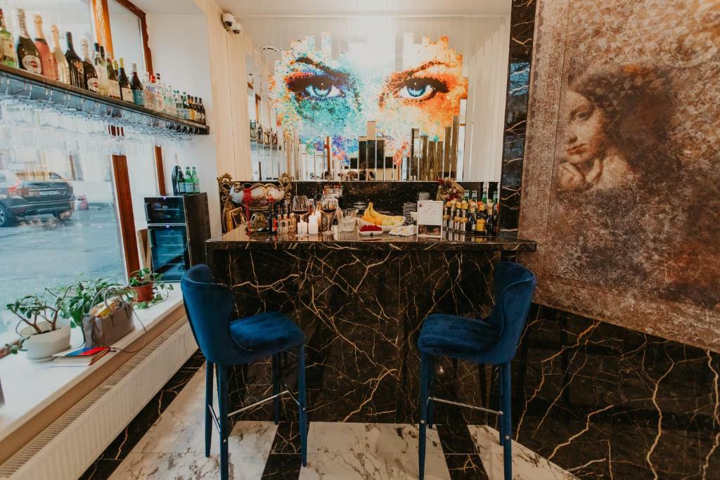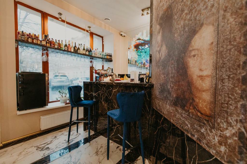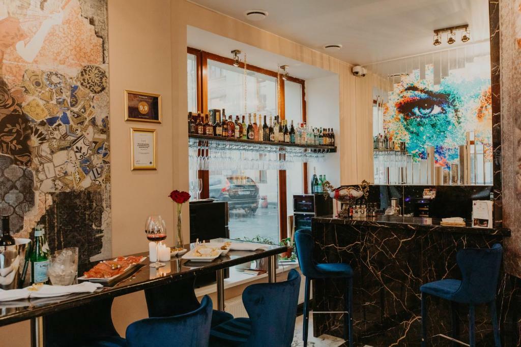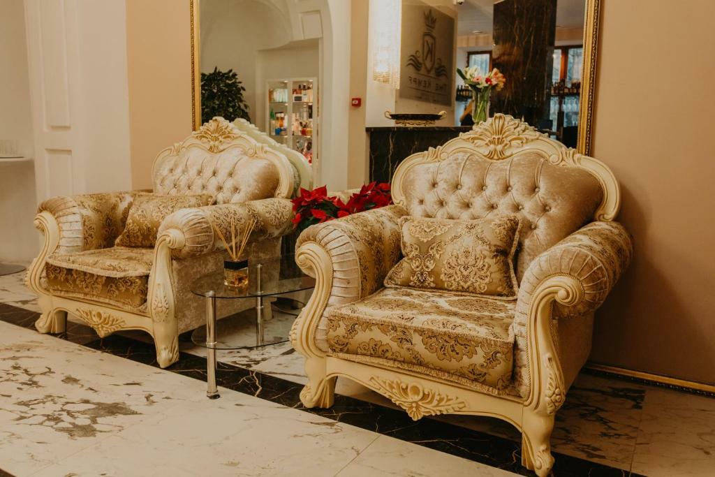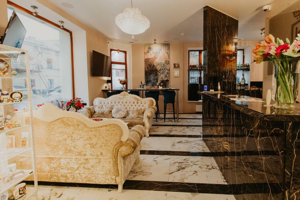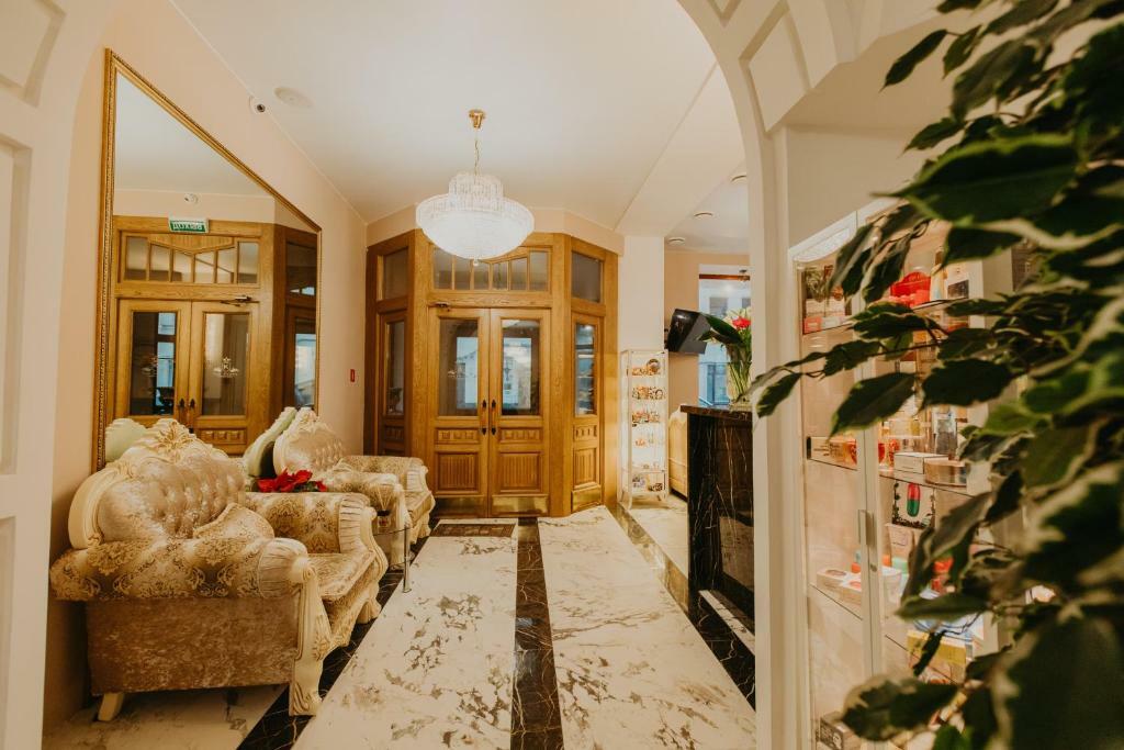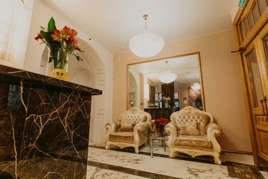 Просторные номера и люксы оборудованы комфортными зонами для работы и отдыха, панорамными окнами, мраморными ванными комнатами. Каждый номер снабжён всеми необходимыми гигиеническими средствами, комплиментарной водой, а также кофемашиной, чайником, утюгом и гладильной доской. Портьеры Blackout позволят выспаться гостям Отеля даже в сезон Белых ночей. Хрустальные люстры украшают не только зоны Ресепшн, коридоров и спален, но и каждую ванную комнату, что позволит каждому гостю почувствовать королевскую стать Петербурга.