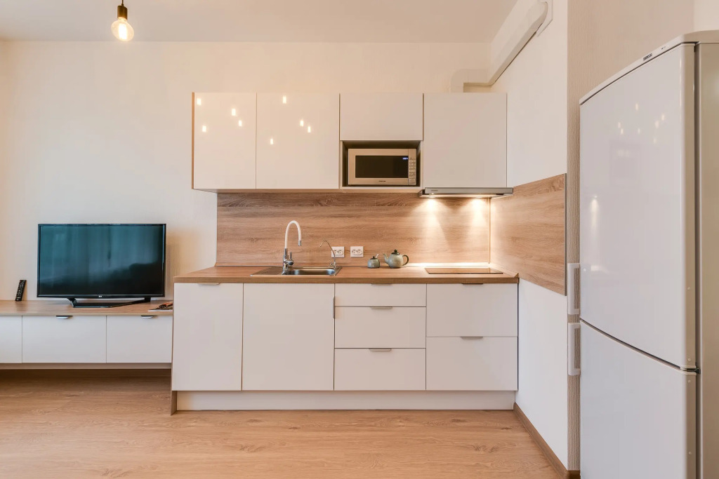 Апартаменты расположены на 6 этаже. В распоряжении гостей есть: HD-телевизор, кабельное телевидение, Wi-Fi, двуспальная кровать, диван-кровать, дополнительное спальное место, стиральная машина, гладильная доска, утюг, фен. Кухня оснащена: посудомоечной машиной, варочной индукционной панелью, вытяжкой, микроволновкой, чайником, посудой и кухонными принадлежностями для приготовления и приёма пищи.