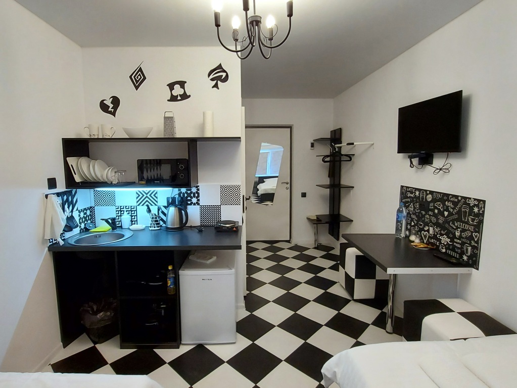 Чтобы вы могли отдохнуть после долгого дня, в номере есть телевизор. В студии две кровати 100х200 см, с беспружинными матрасами. Свой санузел — туалет и душ с шампунем, гелем для душа и полотенцами. Оборудованная кухня — холодильник, микроволновая печь, плита, посуда для приготовления пищи и столовые приборы. В наличии — чай, кофе, вода, тапочки, шампунь, гель для душа, зубная паста и щетка.