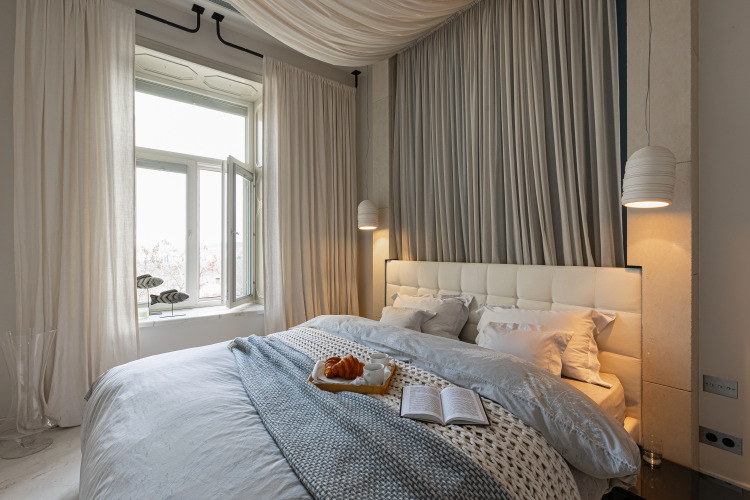 На кухне есть холодильник, индукционная плита, микроволновка, а также посуда, чайник, чай, специи, вода, масло. Имеется стиральная машина. В спальне есть кровать 180х200, в гостиной — диван 100х200. Стол регулируется от журнального до высоты обеденного. Гостям предоставляется французское постельное бельё, полотенца, фен, средства гигиены, одноразовые тапочки.