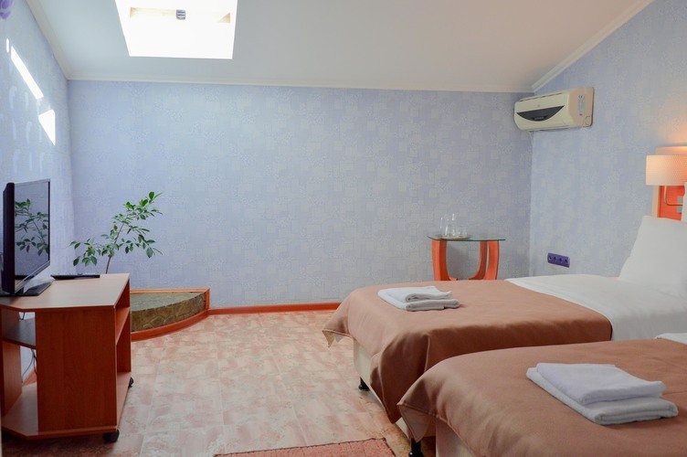 «Стандарт мансардный двухместный». Однокомнатный стандартный номер мансардного типа общей площадью более 25м2, рассчитан на двухместное проживание. В номере: двуспальная кровать/две раздельные кровати шкаф холодильник, телефон плазменный телевизор с цифровыми каналами кондиционер конвектор Wi-Fi интернет санузел, душ кабинка набор минипарфюмерии фен 2 халата 2 комплекта полотенец.