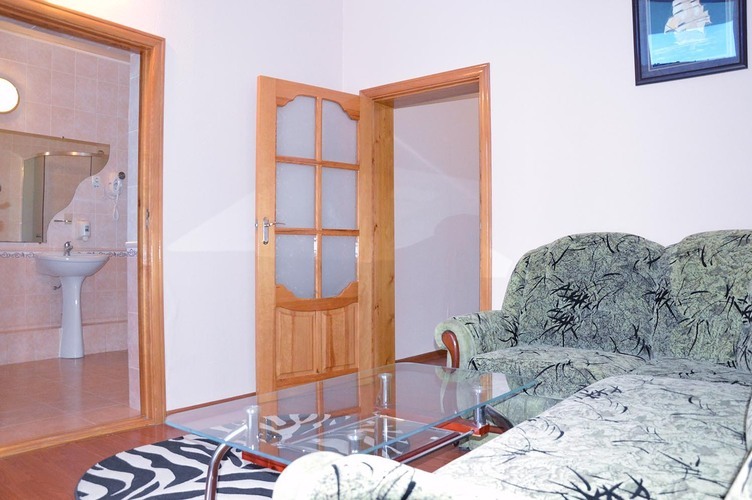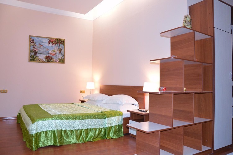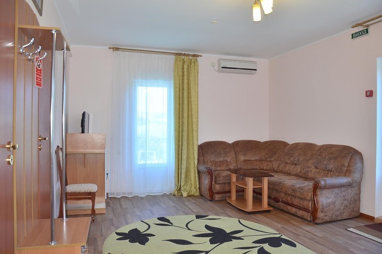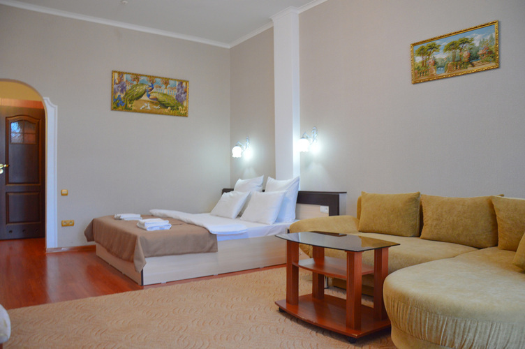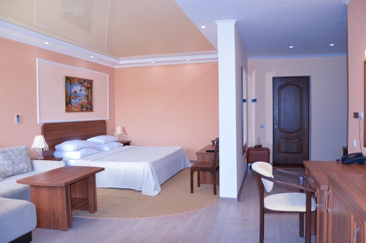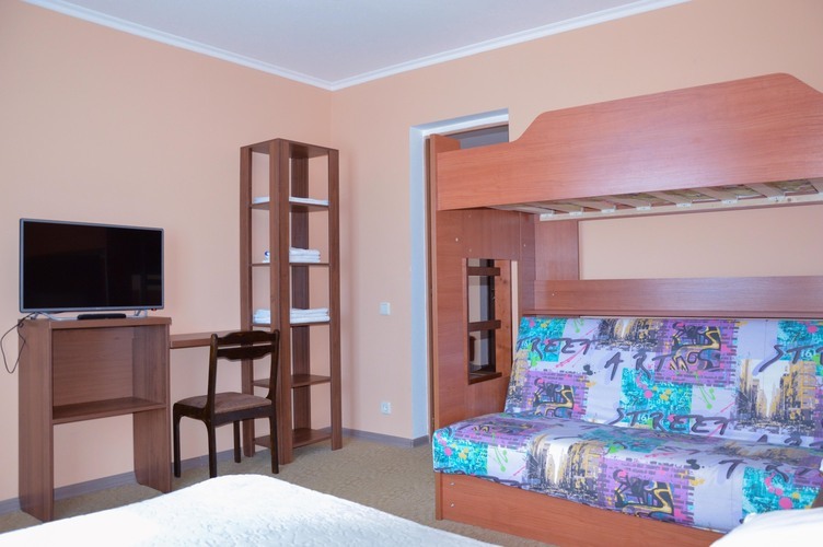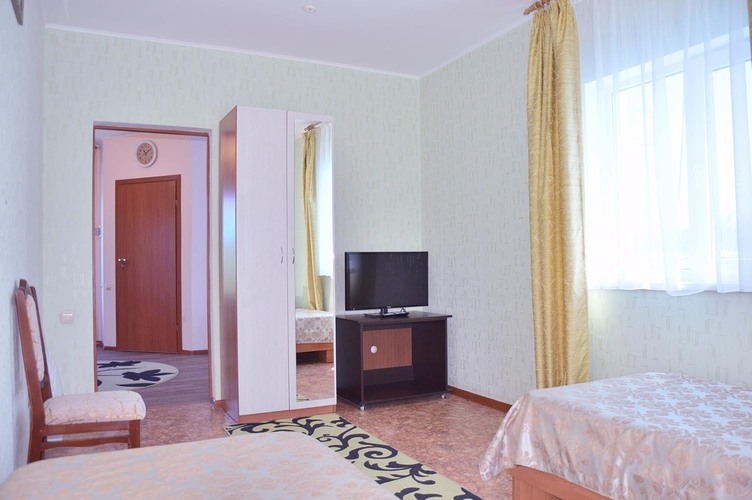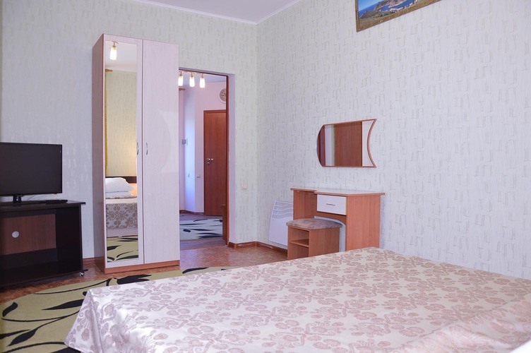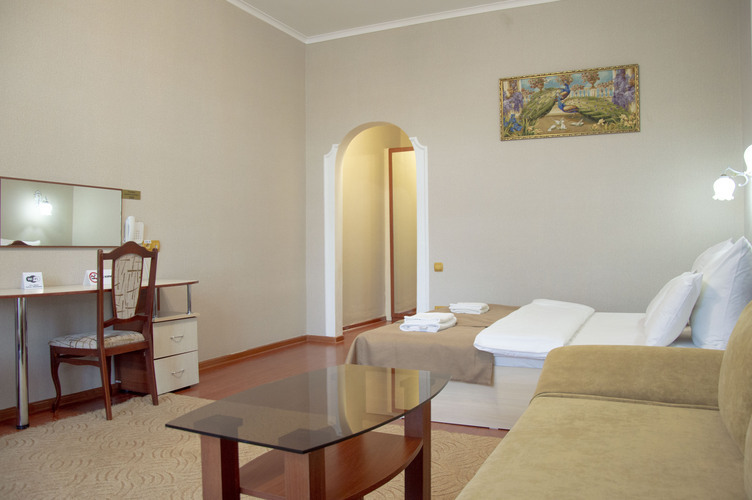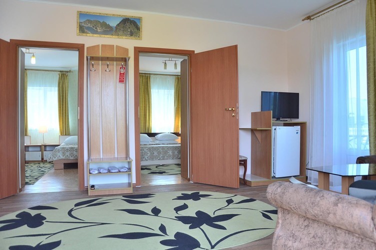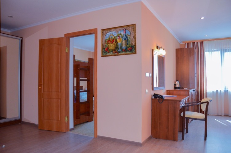 Трехкомнатный номер, общей площадью 55 м2, рассчитан на четырехместное проживание. Отдельный выход на балкон. В номере: двуспальная кровать 2 односпальные кровати диван телефон плазменный телевизор с цифровыми каналами кондиционер конвектор Wi-Fi интернет холодильник санузел, душ кабинка набор минипарфюмерии фен 2 халата 2 комплекта полотенец.
