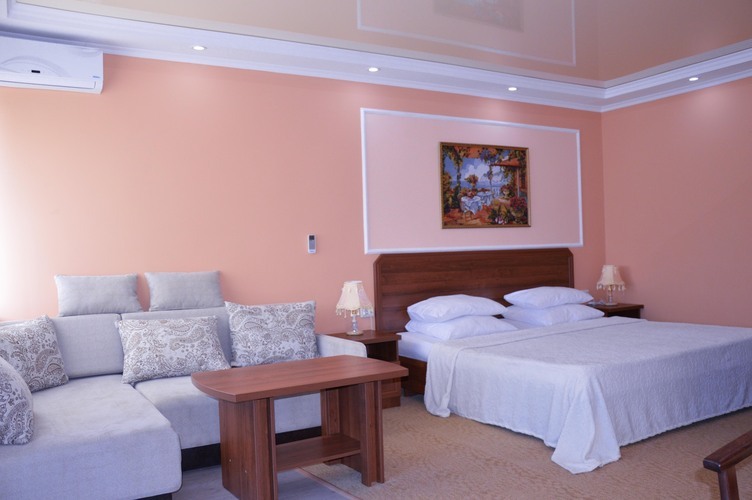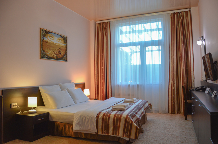 «Стандарт двухместный», общей площадью 30 м2, рассчитан на двухместное проживание. В номере: двуспальная кровать Диван холодильник телефон плазменный телевизор с цифровыми каналами кондиционер конвектор Wi-Fi интернет санузел, душ кабинка набор минипарфюмерии фен 2 халата 2 комплекта полотенец.