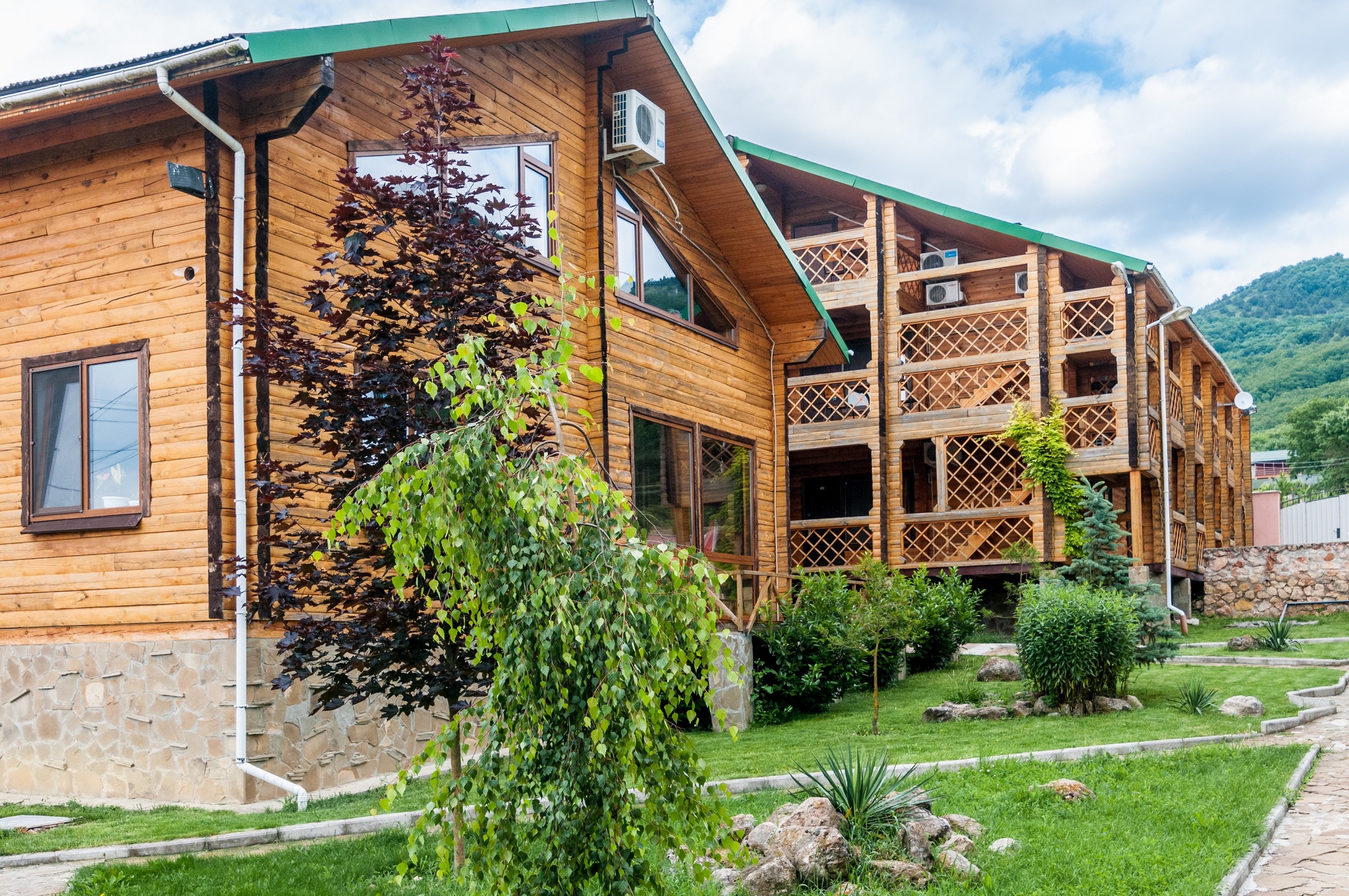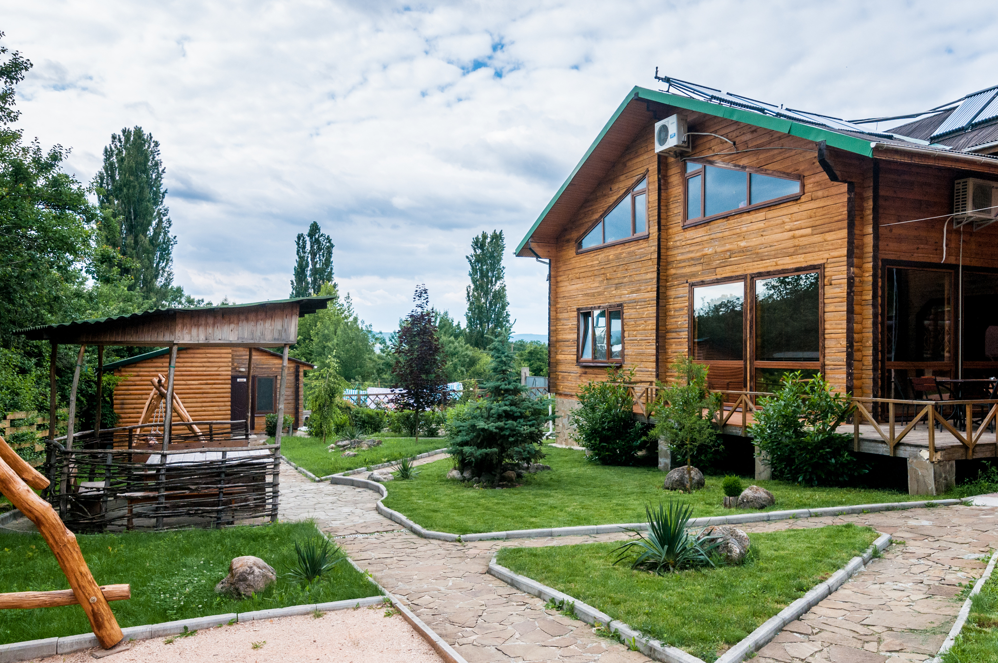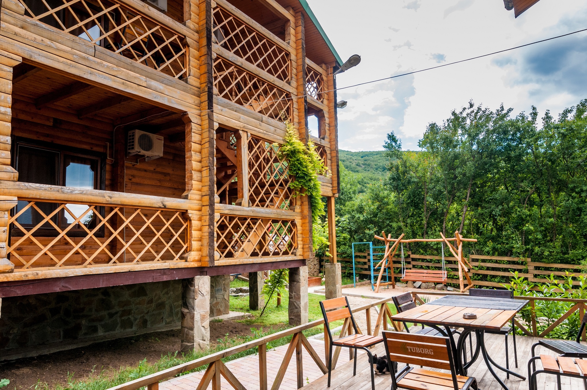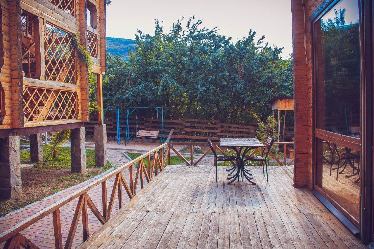 Гостиница находится в Байдарской долине. Номерной фонд находится в трехэтажном здании. Здание из сруба. площадь двухместных номеров 20 м.кв. На первом этаже 5 двухместных номера с раздельными кроватями. На втором этаже 8 двухместных номеров, из них два с раздельными кроватями и шесть с двуспальными кроватями. На третье этаже трехкомнатный люкс. Площадь номера 70 м.кв. В номере две спальни с двуспальными кроватями и большой зал . В зале раскладной диван, мягкий уголок, кухонная стенка и электрический камин. Все номера с удобствами ( душ, туалет, холодильник, кондиционер.) телевизоры только на втором и третьем этаже. Также на территории гостиницы есть столовая, бильярдная, баня и открытый бассейн.