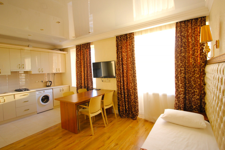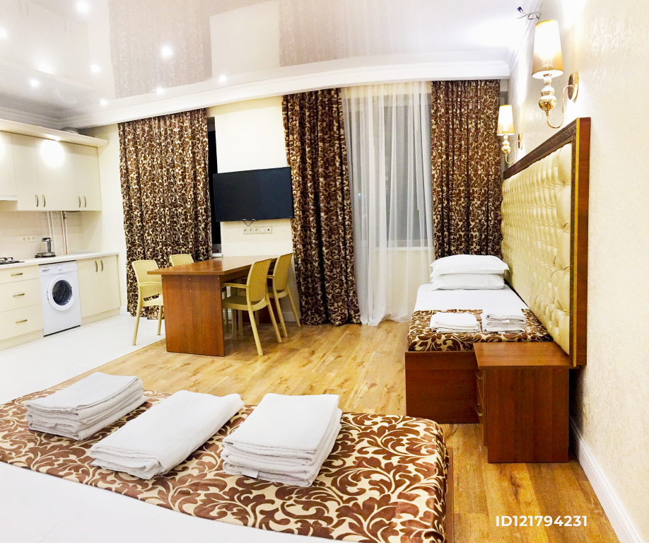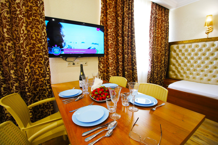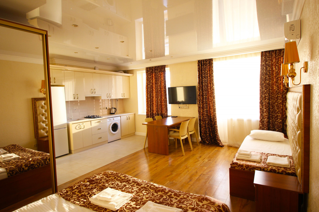 Чтобы вы могли отдохнуть после долгого дня, в номере есть телевизор и халат. Оснащение зависит от выбранной категории номера.