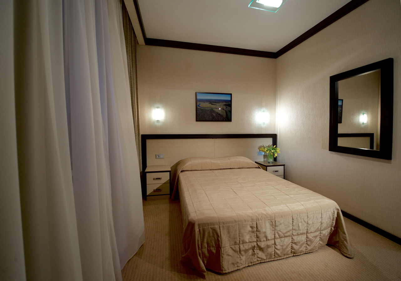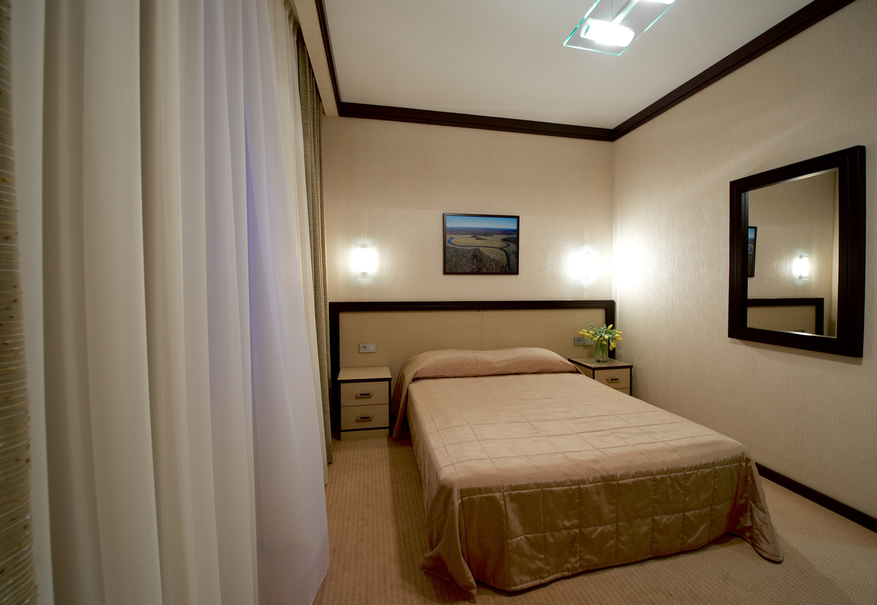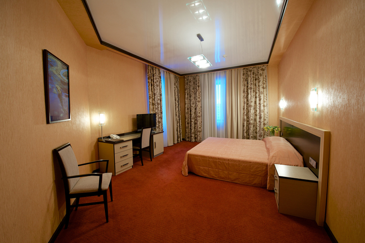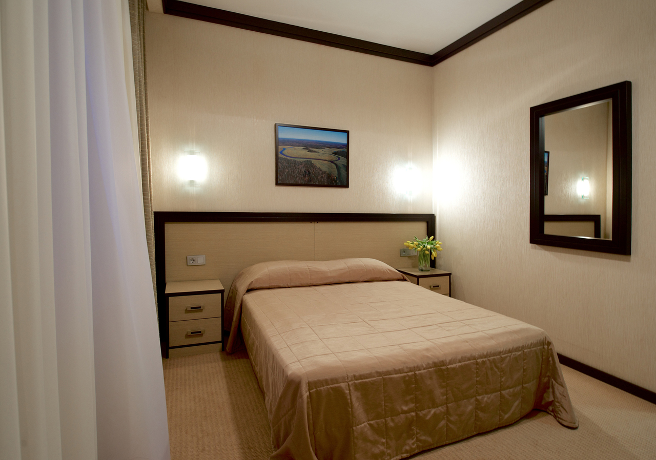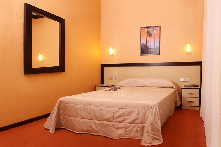 Однокомнатный номер с двуспальной кроватью 160*200 - оснащен телевизором, мини баром, шкафом для одежды, ванной комнатой с ванной, набором полотенец и гигиенических принадлежностей, фен. В номере также есть рабочее место, кондиционер. На территории гостиницы действует Wi-Fi, для гостей круглосуточно открыт бесплатный тренажерный зал.