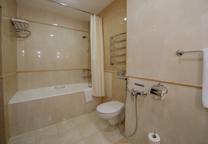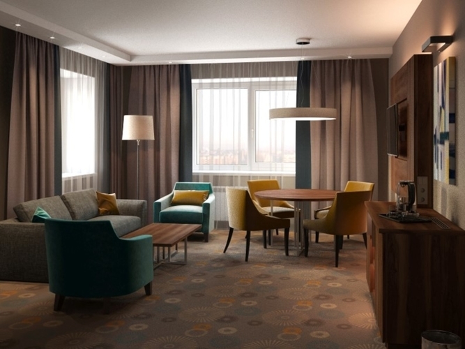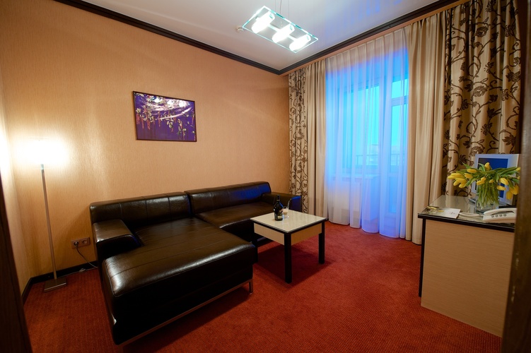 Двухкомнатный номер, включает в себя гостиную и спальню. Номер оснащен двуспальной кроватью 180*200, телевизором, мини баром, шкафом для одежды, ванной комнатой с ванной, набором полотенец и гигиенических принадлежностей, фен. В номере также есть рабочее место, зона отдыха, состоящая из журнального столика и дивана, кондиционер, балкон. На территории гостиницы действует Wi-Fi, для Гостей круглосуточно открыт бесплатный тренажерный зал.