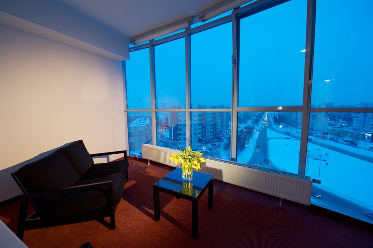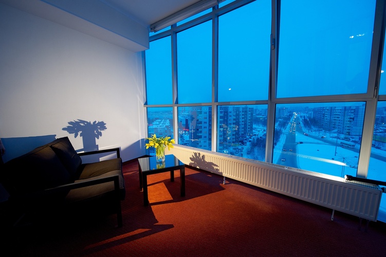 Однокомнатный номер с двуспальной кроватью 160*200 - оснащен телевизором, мини баром, шкафом для одежды, ванной комнатой с ванной, набором полотенец и гигиенических принадлежностей, фен. В номере также есть рабочее место, кондиционер, балкон 10 м2, с которого открывается потрясающая панорама на город Сургут. На территории гостиницы действует Wi-Fi, для гостей круглосуточно открыт бесплатный тренажерный зал.
