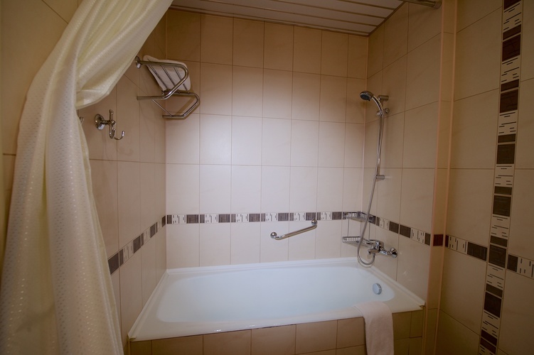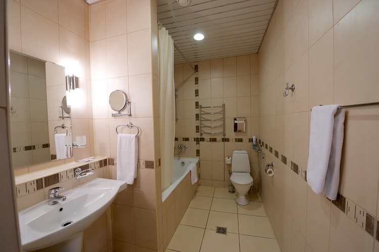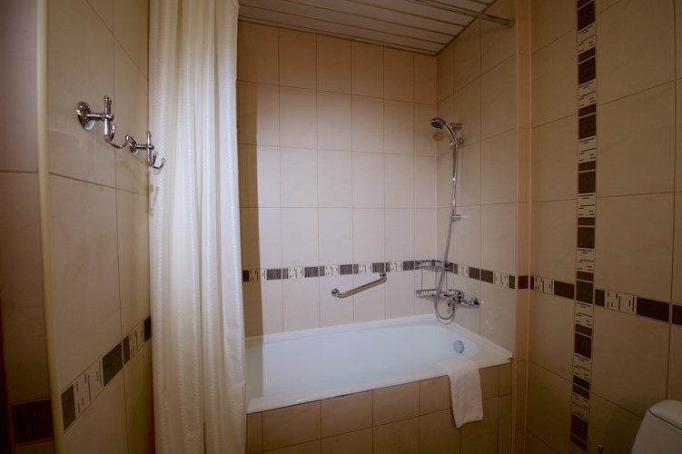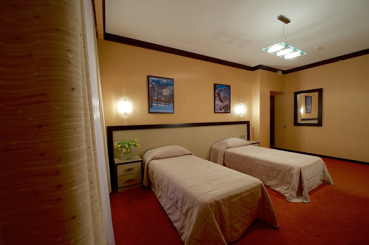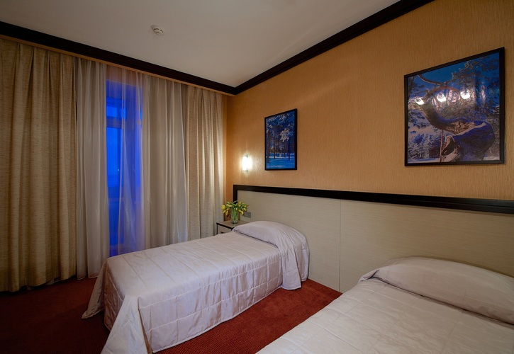 Однокомнатный номер с двумя односпальными кроватями 90*200 - оснащен телевизором, мини баром, шкафом для одежды, ванной комнатой с ванной, набором полотенец и гигиенических принадлежностей, фен. В номере также есть рабочее место, кондиционер, балкон остеклен. На территории гостиницы действует Wi-Fi, для гостей круглосуточно открыт бесплатный тренажерный зал.
