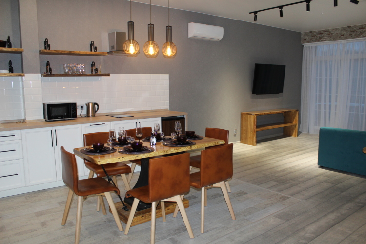 В апартаментах могут разместиться до 4-х человек. Имеется двуспальная кровать и диван, также есть: бесплатный Wi-Fi, два больших телевизора, кондиционер, полностью оборудованная кухня со всем необходимым для самостоятельного приготовления пищи, посудомоечная машина, стиральная машина, утюг и гладильная доска, фен, постельное бельё и комплект полотенец, тапочки, а также чай, кофе и прочее.