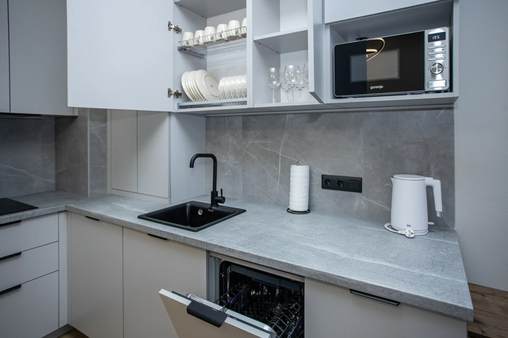 В распоряжении гостей: спальня с кроватью queen-size и системой хранения, кухня-гостиная с техникой премиум-класса (встроенный холодильник, посудомоечная машина, индукционная плита), полный набор посуды, зона отдыха с диваном-трансформером, smart-TV и Wi-Fi, текстиль из натуральных материалов, black-out шторы.