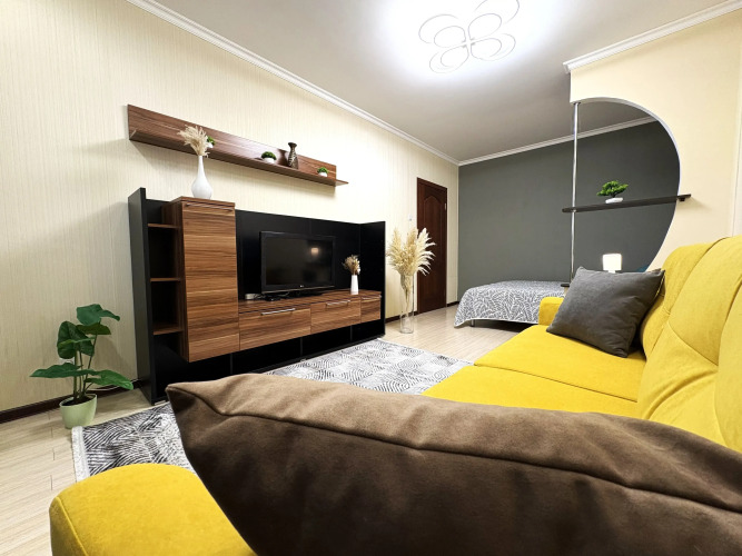 Апартаменты имеют 1 комнату, кухню с индукционной варочной поверхностью, встроенным духовым шкафом, холодильником, микроволновой печью, посудой и всем необходимым для приготовления пищи.