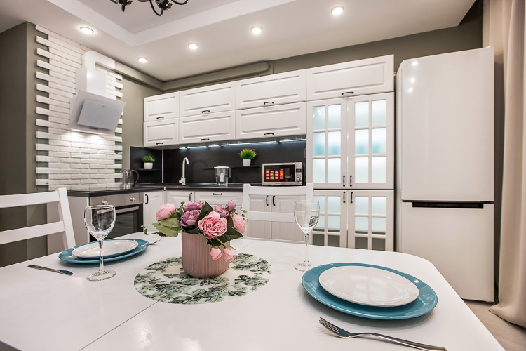 На кухне — варочная поверхность, встроенный духовой шкаф, холодильник, микроволновая печь, посуда для приготовления еды.