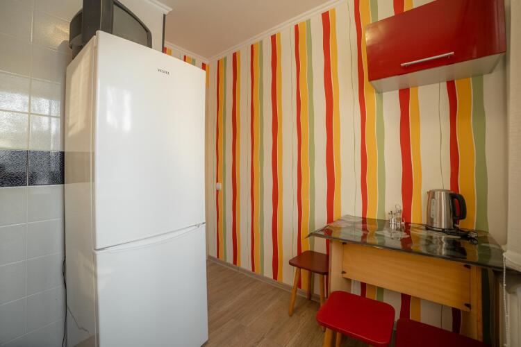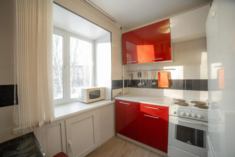 В апартаментах имеются 2 отдельных кровати: угловой диван-кровать, двуспальный диван + раскладушка на 5 спальных мест. Есть стульчик для кормления. Предоставляется по запросу. Есть телевизор — плазма в обеих комнатах. Из удобств есть: комод, холодильник, стиральная машинка-автомат, кухонный стол, электрическая плита, микроволновка, чайник, интернет, кабельное ТВ, посуда: сковородки и кастрюли, одеяла и подушки. Постельное бельё также прилагается. Работает безлимитный WI-FI.