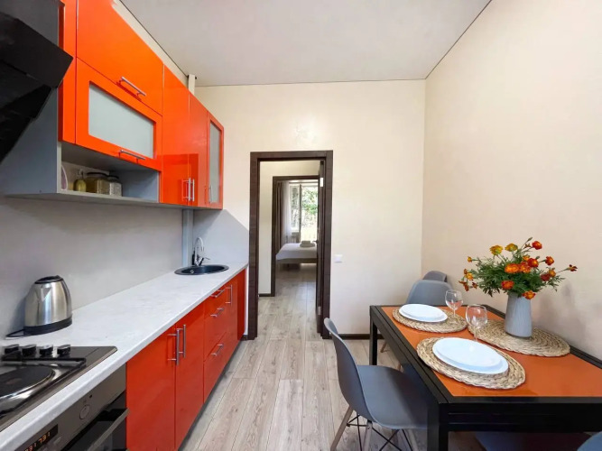 В распоряжении гостей есть: двуспальная кровать 160х200, двуспальный диван 160х200, двухъярусная кровать 90х200. Также в апартаментах доступны: кухня с плитой, духовой печью, микроволновой печью, холодильником, чайником и необходимым для приготовления пищи, в том числе — посуда, столовые приборы, чай, кофе, специи. К услугам гостей доступны Wi-Fi, телевизор, кондиционер, утюг. В апартаментах есть раздельный санузел, в ванной комнате гости найдут: душ, зеркало, стиральную машину, фен и набор туалетно-косметических принадлежностей.
