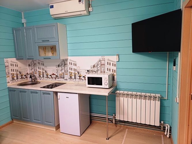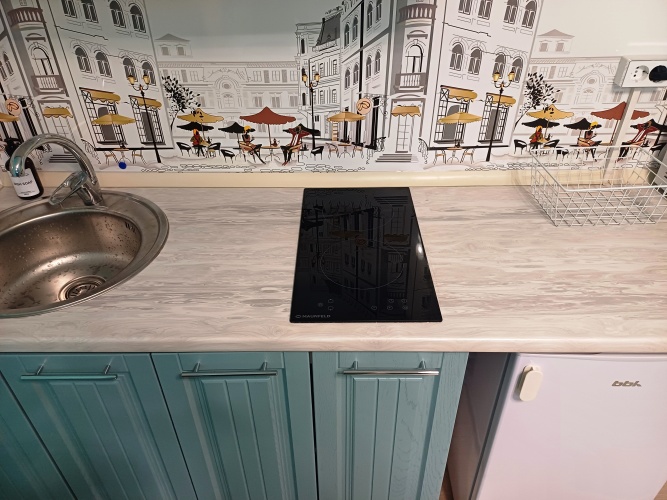 Кухонная зона оборудована кухонной мебелью, микроволновой печью, варочной панелью, холодильником, электрочайником и набором посуды. Предоставляются чай, кофе, сахар, соль, кастрюли и сковороды.