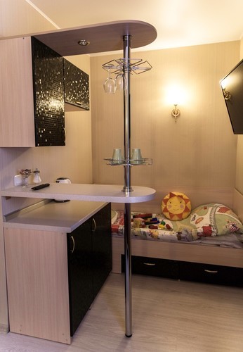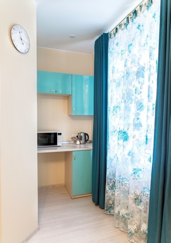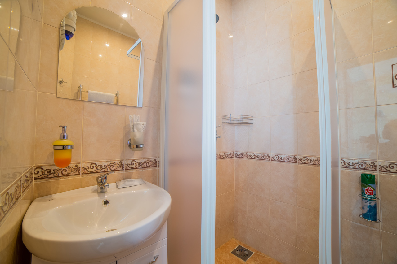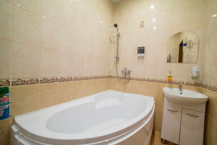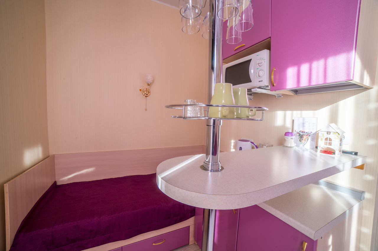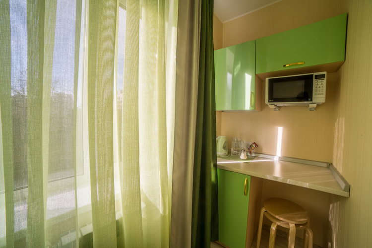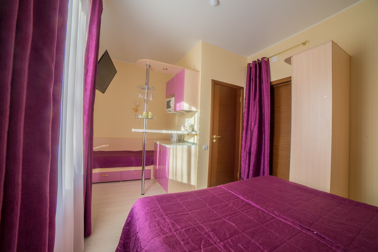 Предусматривает размещение до 3-х человек. (2+1 либо 1+1+1). Номер оборудован отдельным санузлом с большой ванной. В номере: двуспальная кровать (или две отдельные кровати) и дополнительная стационарная кровать, кухонный уголок (холодильник с мини-баром, СВЧ, электрический чайник, посуда), барная стойка (с фужерами и бокалами), две прикроватные тумбы, плазменный телевизор, барные стулья 2 шт., шкаф для одежды, кондиционер, бесплатный чай и сахар.