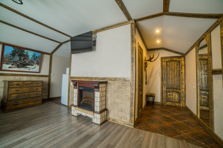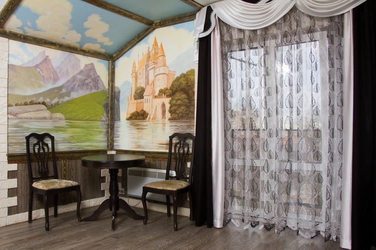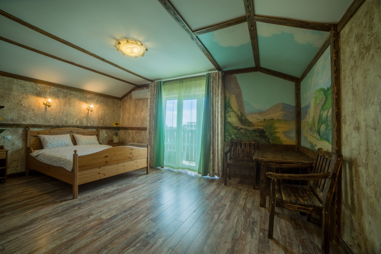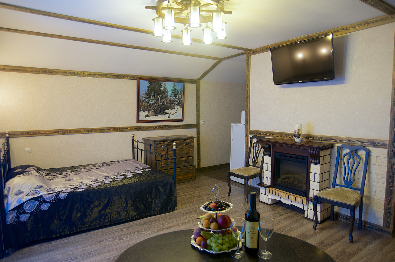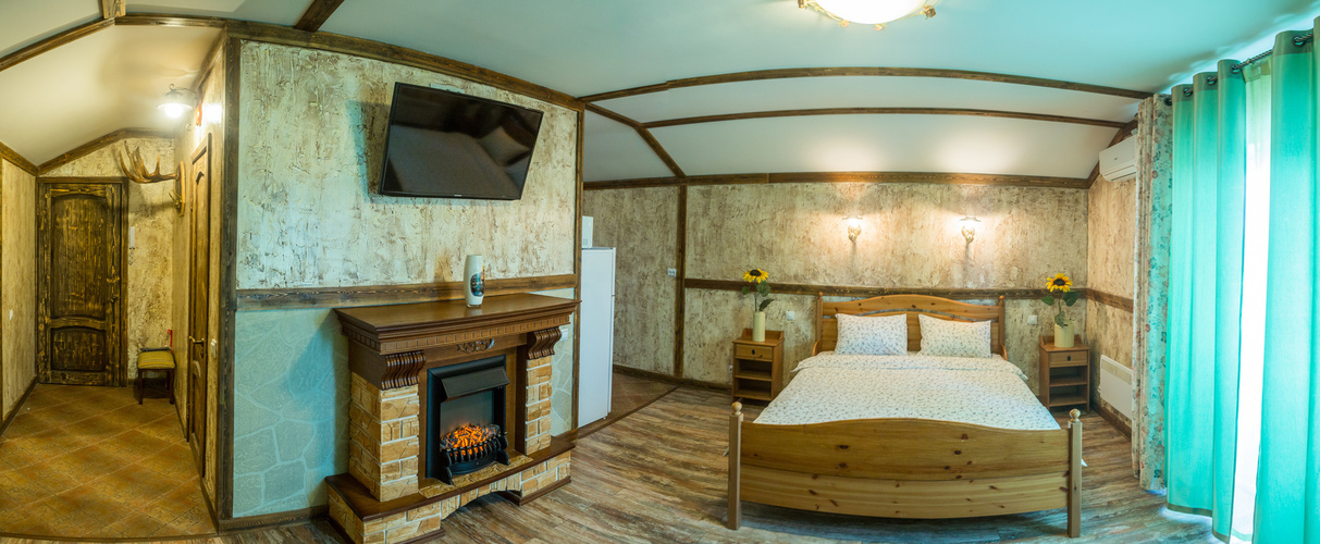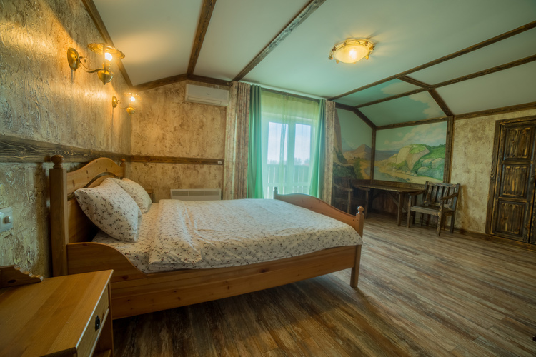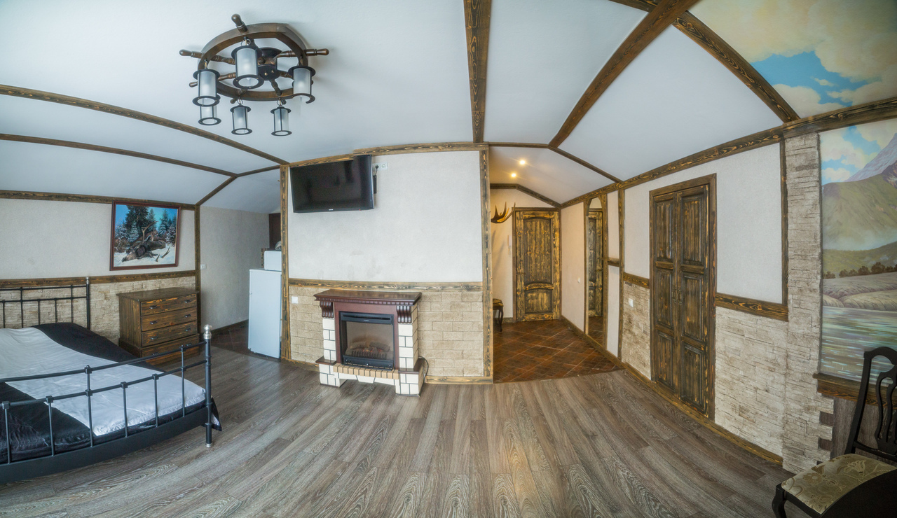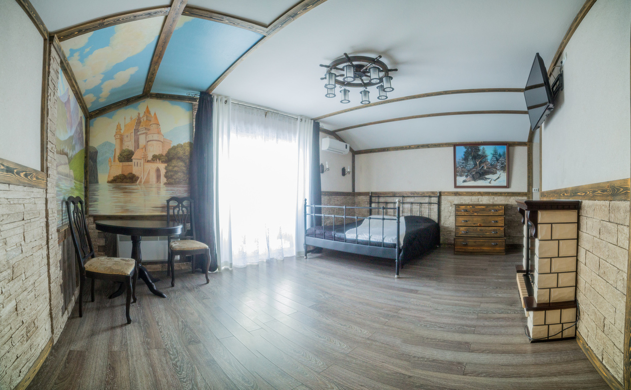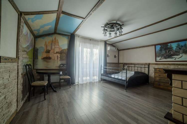 Номера площадью 40 кв м, 2-х местные с балконом для изысканных гостей. «Альпийское шале» и "Старинный замок" с художественной отделкой! В номере: большая двуспальная кровать, плазменный телевизор большой диагонали, состаренная мебель: стол, стулья, встроенный шкаф. Полноценная кухня в номере, и, конечно же камин. Регулируемое освещение кондиционер. Хорошая звукоизоляция за двумя дверями!