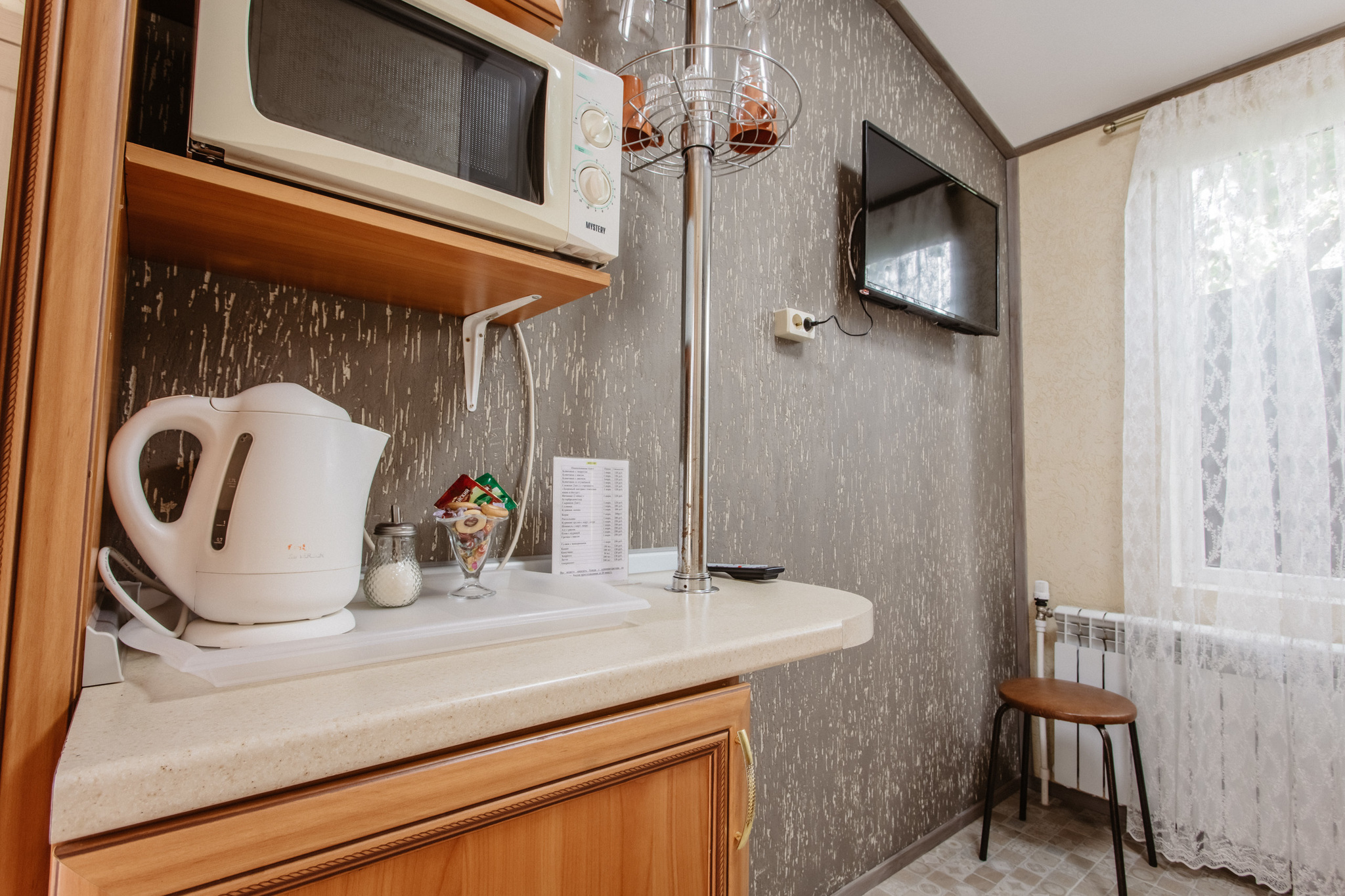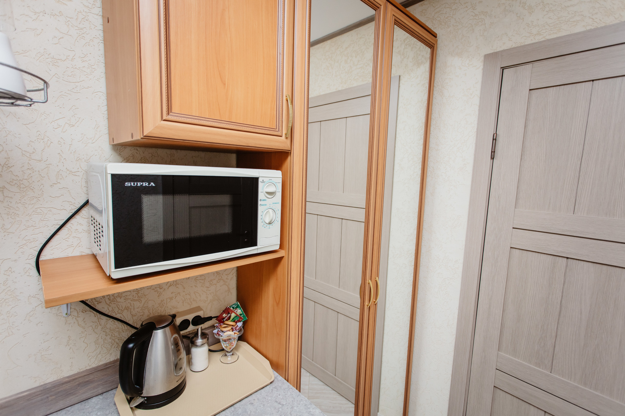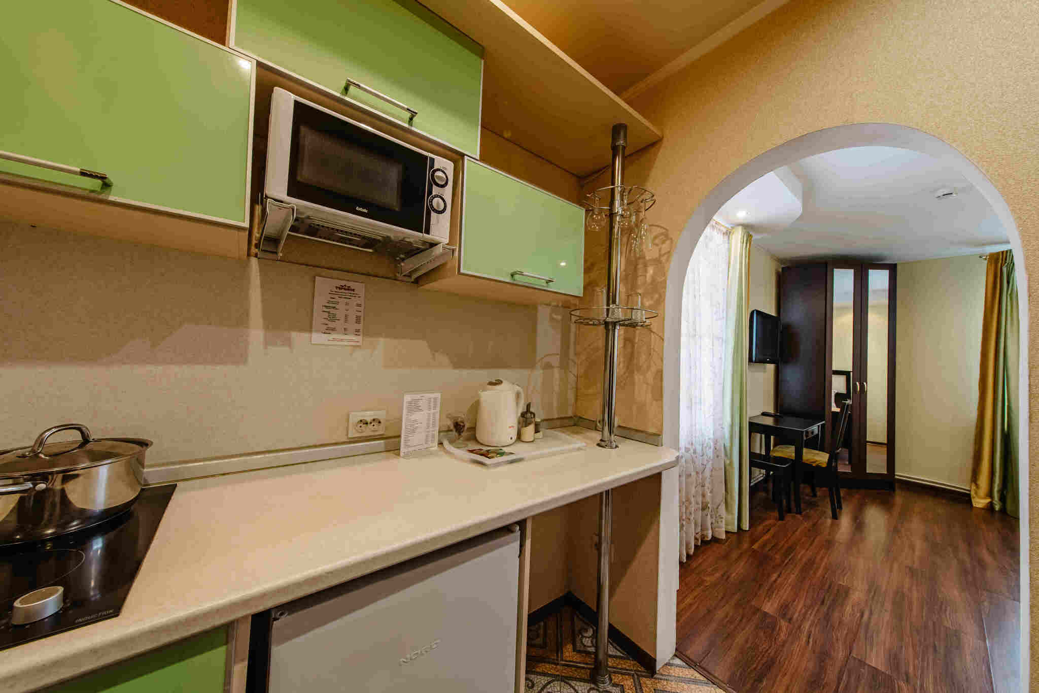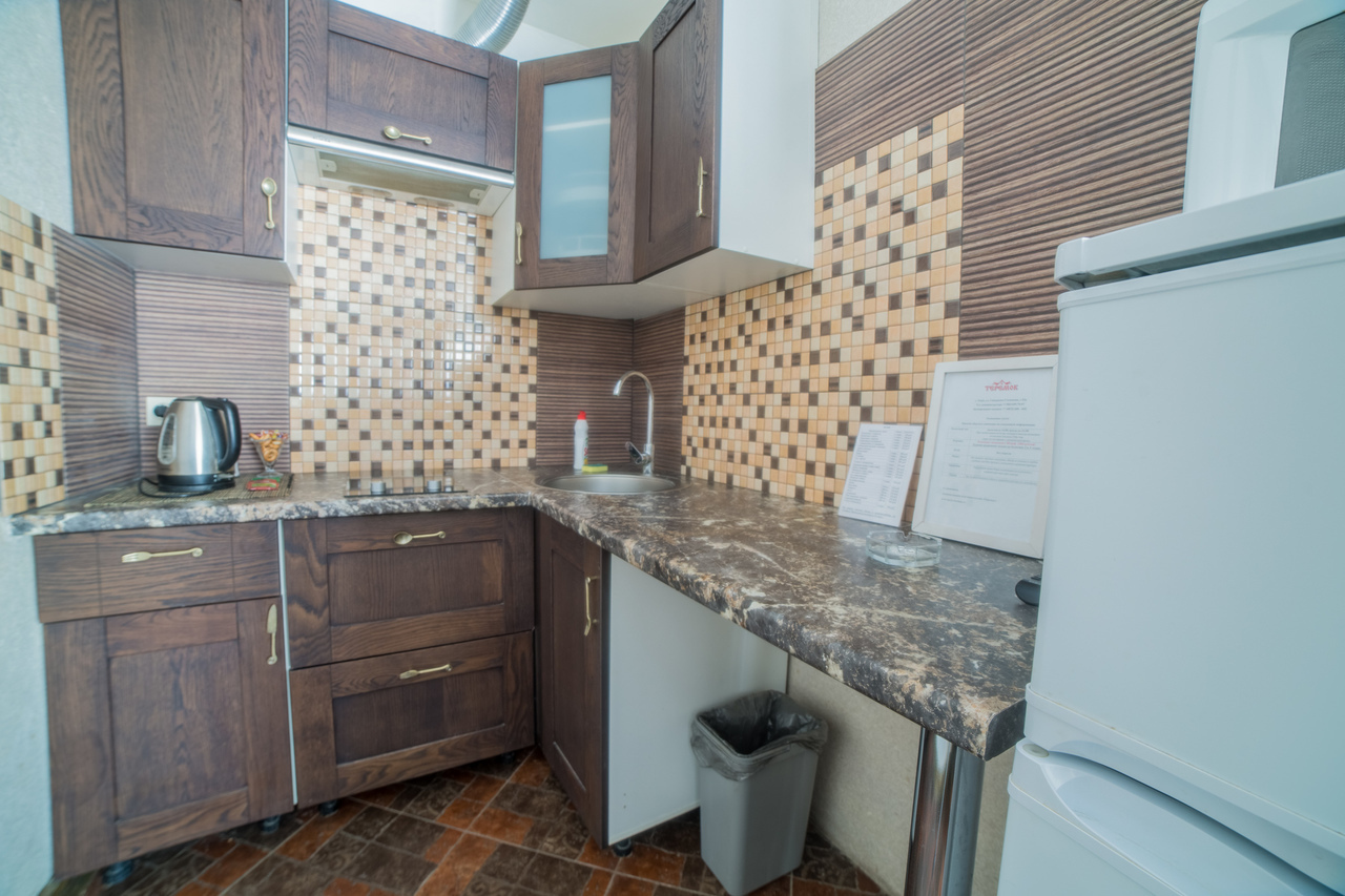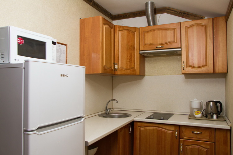 Каждый номер гостиницы оборудован мини-кухней с холодильником, СВЧ печью, электрическим чайником, индукционной плитой. В отеле организовано круглосуточное питание. На каждом этаже стоят кулеры с питьевой водой.