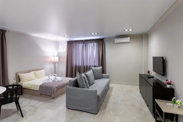 В апартаментах предусмотрено четыре спальных места: двуспальная кровать и диван.