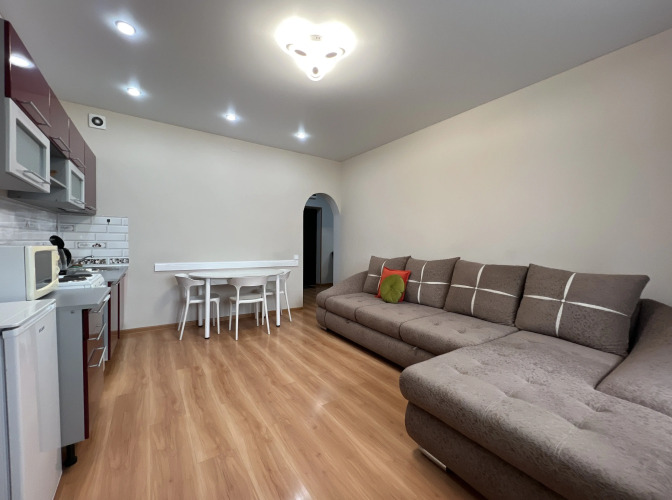 Квартира площадью 50 кв.м с застеклённым балконом 7 кв.м расположена на 7 этаже. В квартире имеется шесть спальных мест: двуспальная кровать шириной 140 см и два раскладных дивана. На полу уложен ламинат, линолеум, в ванной комнате — плитка.