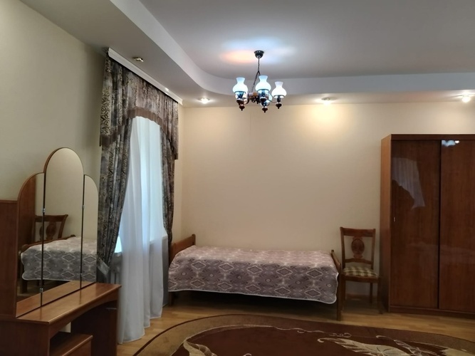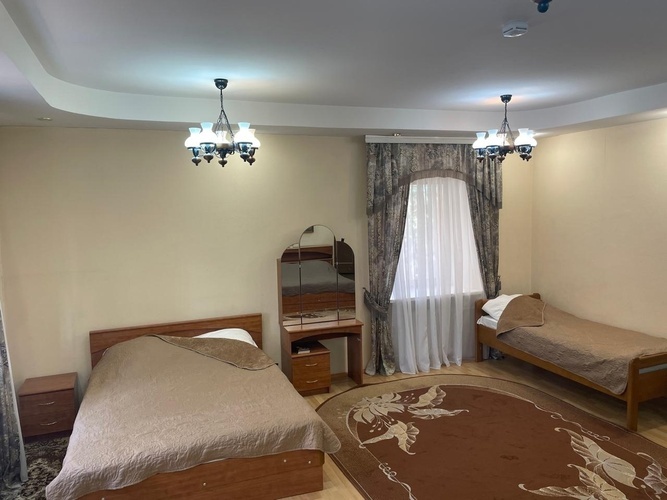 Однокомнатный номер c двуспальной кроватью и односпальная кровать. Прикроватными тумбочками, трюмо, шкаф, диван на два места и кресло. Также в номере имеется шкаф, комод с зеркалом. В ванной комнате установлен луш и предоставляется набор косметических принадлежностей.