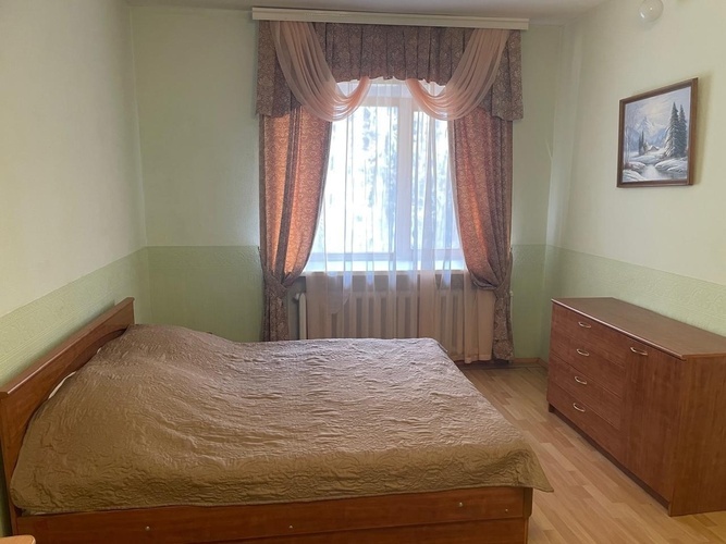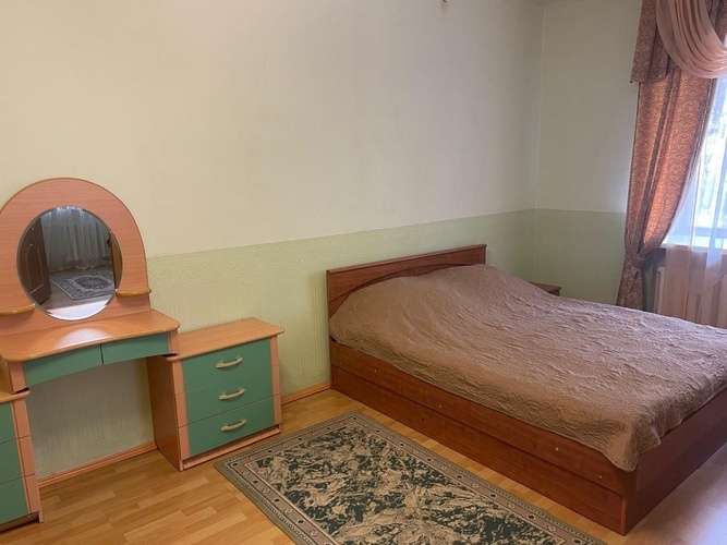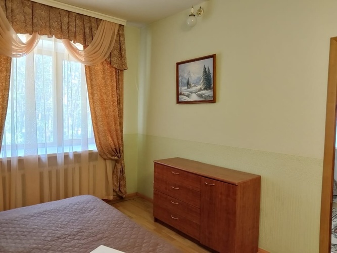 Двухкомнатный номер люкс 40 кв.м. Расположен на 2 этаже здания. В номере имеется двуспальная кровать, трюмо, шкаф. Также установлен комод с зеркалом. Вторая комната оборудована двух- спальной кроватью и односпальной кроватью с прикроватными тумбочками. В ванной комнате установлен душ и предоставляется набор косметических принадлежностей.