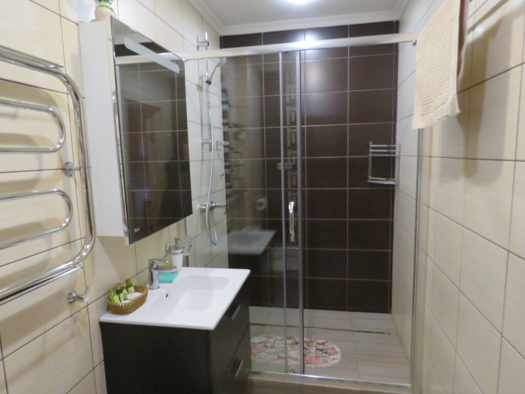 Первый гостевой номер 42 кв.м на четырёх человек — 2 укомплектованные спальни: двуспальная кровать, 2 прикроватные тумбочки, ночные светильники, тумбочка для белья, стулья, телевизор, кухня-гостиная, шкаф-купе, кухонный гарнитур, электрическая плита, вытяжная система, холодильник, микроволновая печь, телевизор, электрический чайник, набор посуды для приготовления пищи и еды, столовые приборы, чай, сахар. Санузел: душевая кабина, унитаз, биде, туалетный столик с зеркалом, фен, набор полотенец, туалетная бумага.