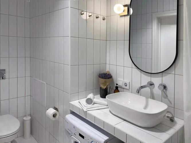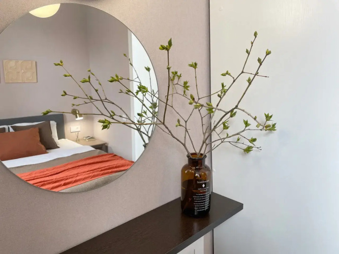 Двухкомнатная квартира может разместить до 4 человек, в том числе с детьми. На кровати есть матрас 160 х 200 см, в гостиной есть раскладывающийся диван. Предоставляется белое постельное бельё и полотенца; бельё стирается и гладится в профессиональной прачечной. Возможно размещение с животными.