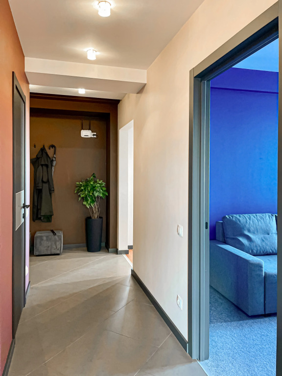 Трёхкомнатная квартира площадью 100 кв. м. расположена на 9 этаже. Возможность размещения до 7 человек, включая детей. В спальне — двуспальная кровать и одноместный диван. В других комнатах — раскладывающиеся диваны. Предусмотрено размещение с животными по согласованию и с доплатой.