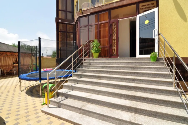 На территории гостевого дома есть открытый бассейн с шезлонгами по периметру. Для детей установлены батут и качели.