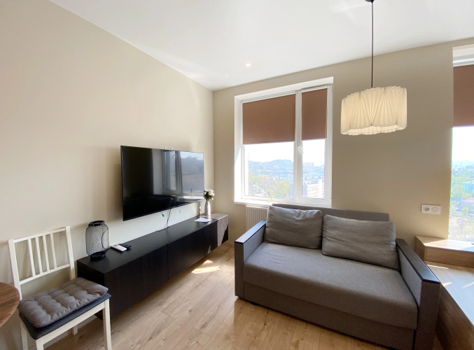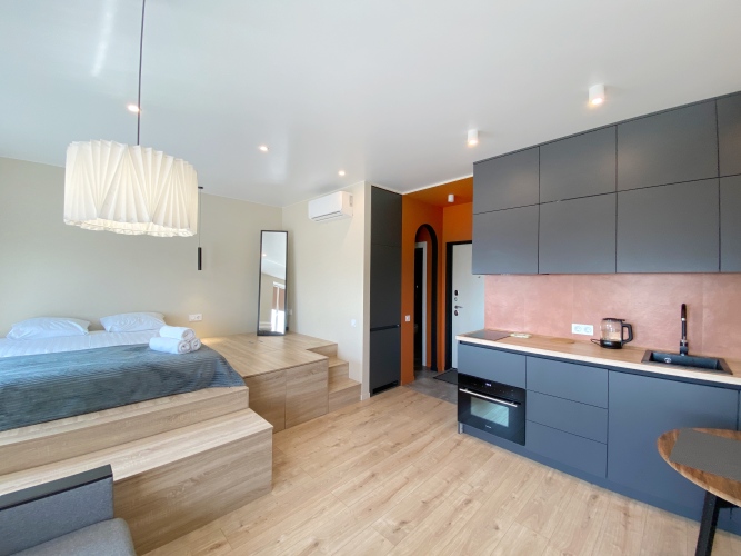 В апартаментах имеются двуспальная кровать и раскладной диван, укомплектованная кухонная зона, есть кухня-гостиная, работает кабельное телевидение и высокоскоростной Wi-Fi, есть фен и утюг. Также есть ванные принадлежности: зубные наборы, гель для душа и шампунь.