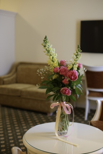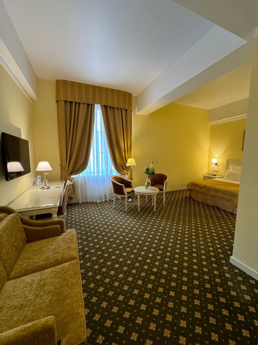 Гостиная + спальня + комната переговоров. Интерьер выполнен в элегантном классическом стиле с элементами барокко. В спальной комнате: двуспальная кровать, прикроватные тумбы, комод, ЖК телевизор, телефон. В гостиной: мягкая мебель, журнальный столик, ЖК телевизор с большим экраном, телефон. В комнате переговоров: стол, стулья, комод. Номер оборудован системой кондиционирования, высокоскоростным доступом в Интернет. В ванной комнате: ванна с гидромассажем и душем, биде, с