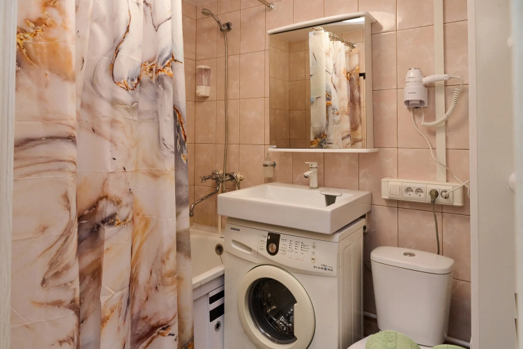 В ванной комнате есть ванна с душем, стиральная машина, фен.