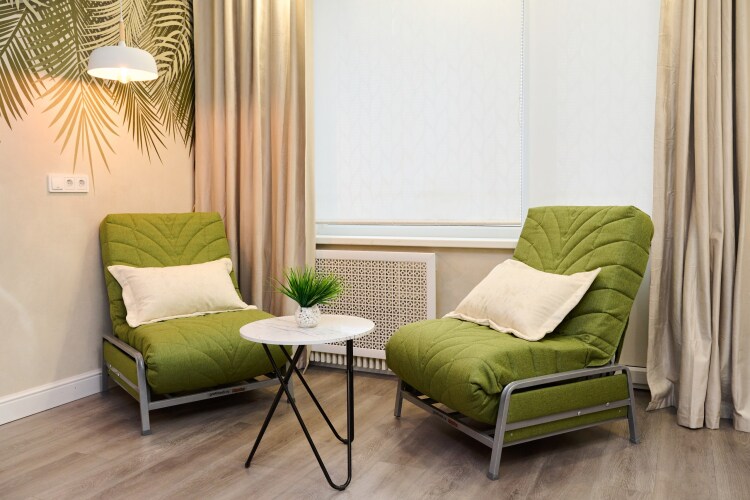 В квартире 3 отдельных спальных места: двуспальная кровать и два раскладных кресла