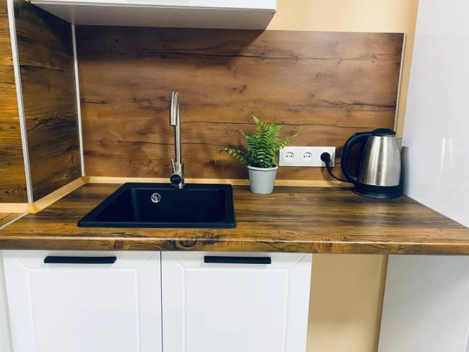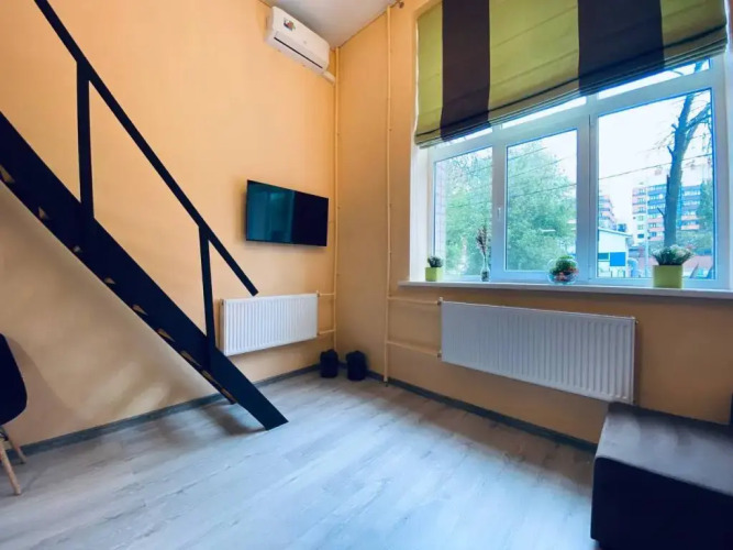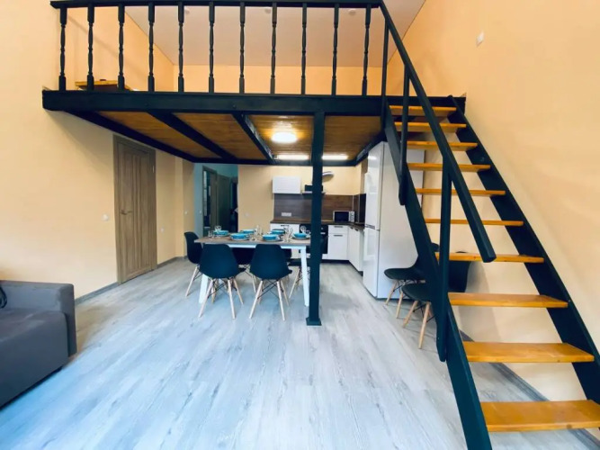 Гостям предлагаются двухуровневые апартаменты с техникой и мебелью: здесь высокие потолки. Подходит для проведения праздников и иных мероприятий.
