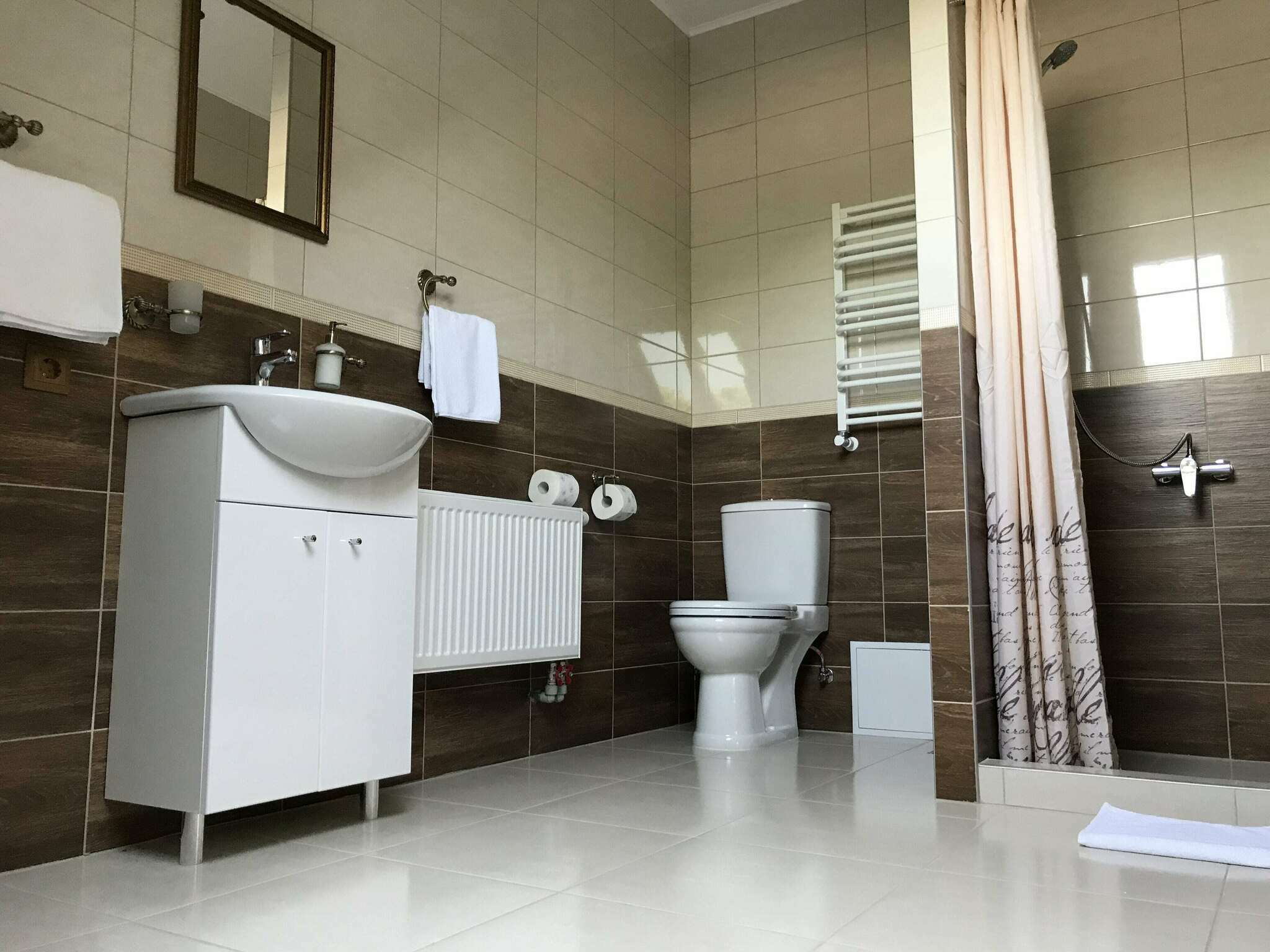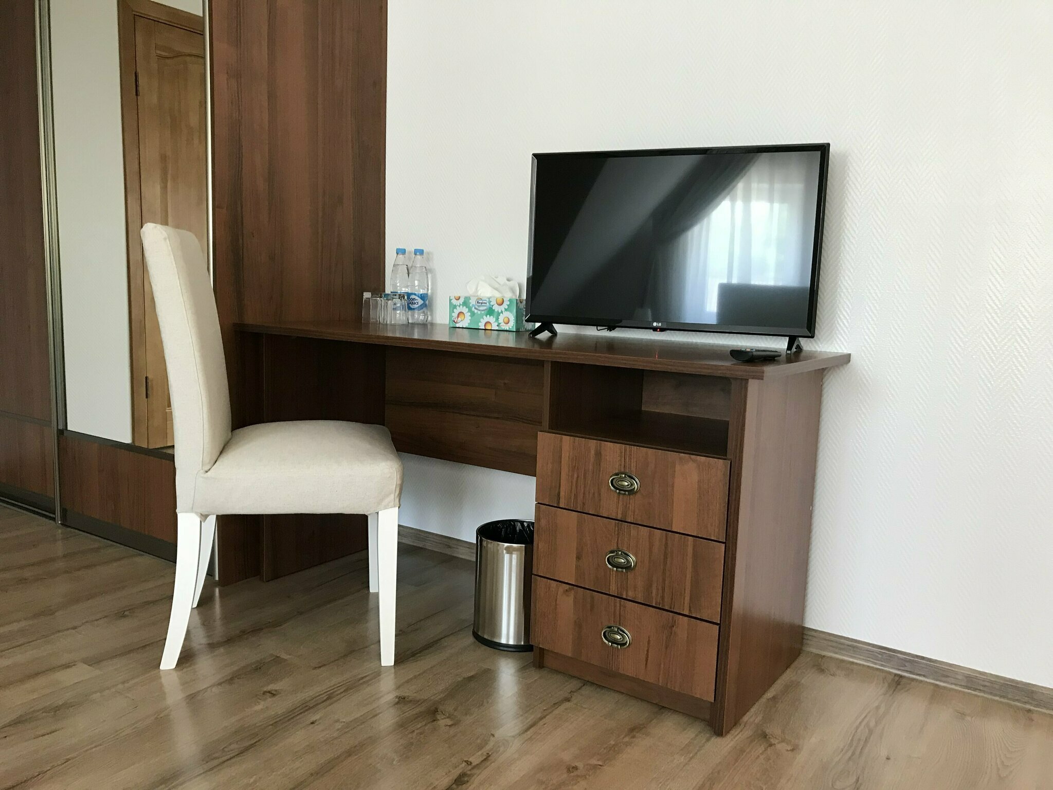 В каждом номере имеется большая двухместная кровать; собственная ванная комната с душем; фен, мини-холодильник, чайник, столовые приборы и тарелки, индивидуальные тапочки; письменный стол со стулом; зеркала в пол; большой шкаф-гардеробная.