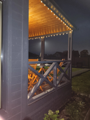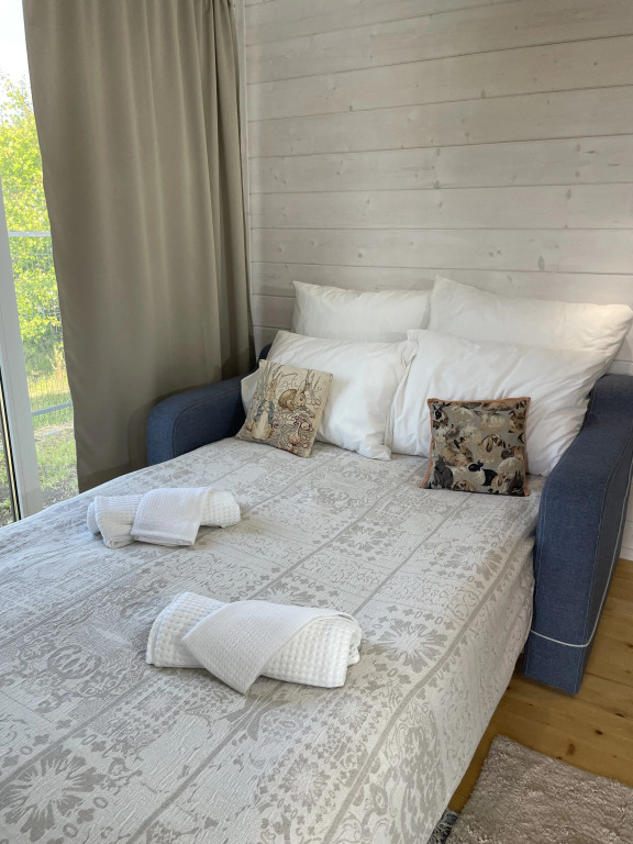 Двухкомнатный частный дом 30 кв. м. расположен на участке 350 кв. м. В частном доме есть терраса, кухня-гостиная с раскладным диваном 120x200, спальня с кроватью 160x200, санузел с душевой кабиной. На территории имеется зона барбекю с принадлежностями, шезлонги. Дополнительно возможна аренда sup-досок и велосипедов.