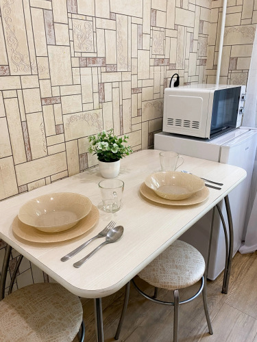 На кухне есть необходимая посуда для приготовления пищи, а также первоначальный запас продуктов.