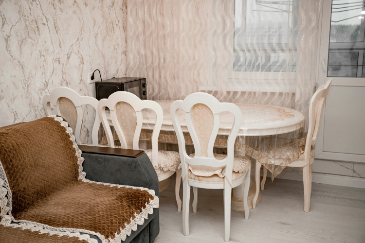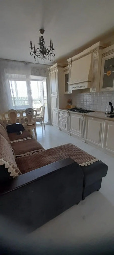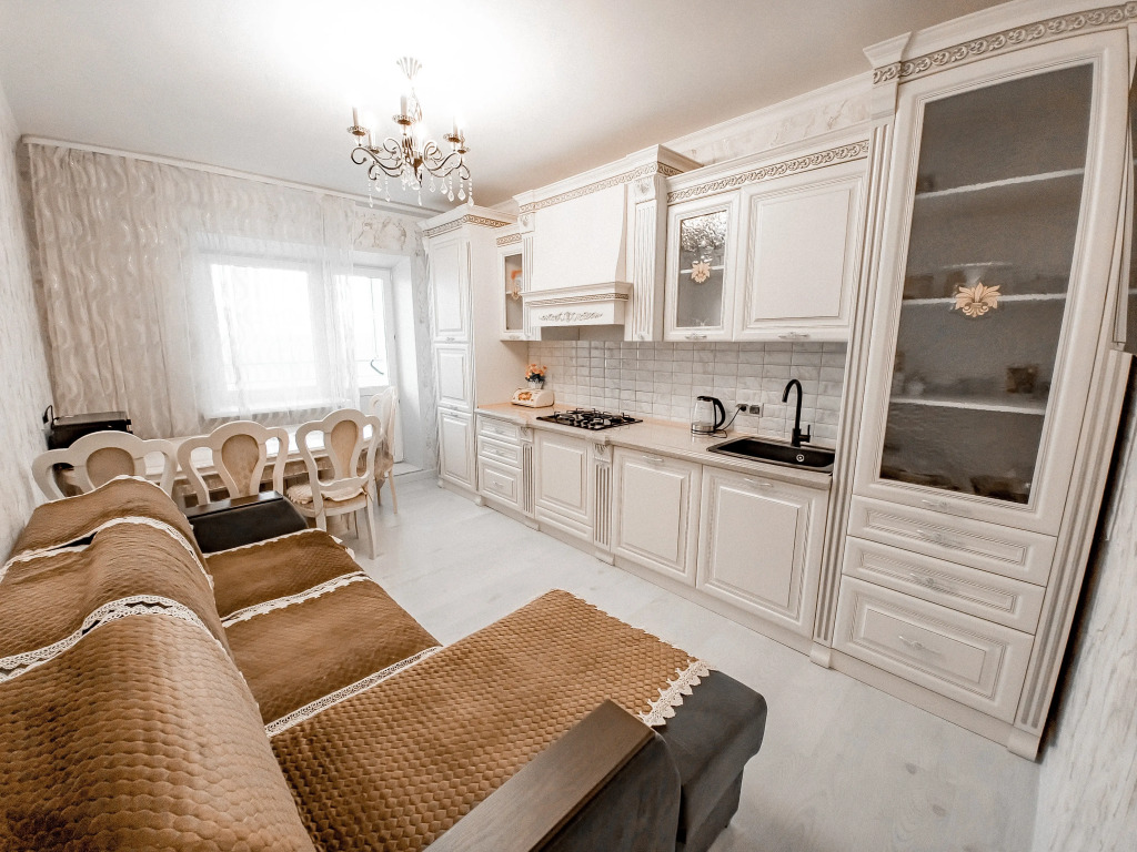 Квартира расположена в новостройке с огороженной территорией и шлагбаумом. Квартира оснащена для проживания. К услугам гостей 5 комплектов постельного белья, одеяла, подушки, фен, пылесос, утюг, Wi-Fi, кондиционер и 2 телевизора — на кухне и в комнате. Площадь кухни-гостиной — 15 кв. м. Кухня укомплектована необходимой посудой, включая кастрюли и сковородки. Духовой шкаф отсутствует. Есть микроволновая печь.