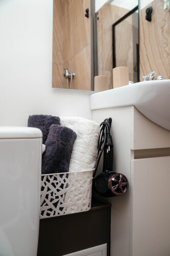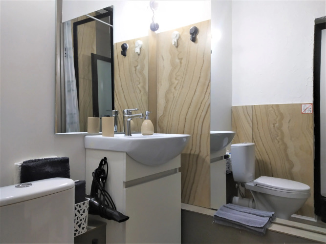 В комнате: двуспальная кровать с ортопедическим матрасом, шкаф, рабочая зона. Отдельная кухня с панорамным окнами и видом на внутренний дворик. Санузел совмещён с душем. На кухне есть варочная поверхность на две конфорки, небольшой холодильник с морозильной камерой, стиральная машина, свч-печь, чайник, кофеварка, кастрюли, сковороды, столовые приборы и посуда. На кухне находится диван размером 100х190 см. Гостям предоставляются: три вида чая, кофе молотый и растворимый, растительное масло, сахар, крупы, зарядное устройство для телефона, сушилка для обуви, зонт, фумигатор, настольные игры, фен, шампунь, кондиционер и гель для душа, одноразовые зубные щётки и тапочки, мицеллярная вода, зубная паста.