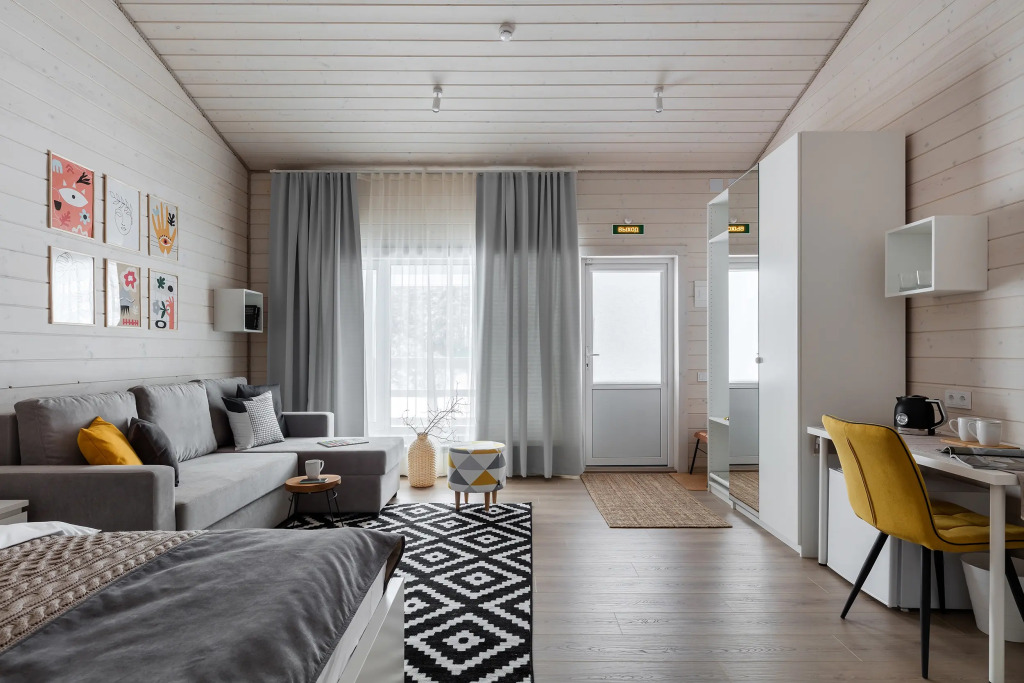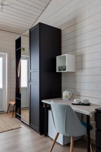 К услугам гостей дизайнерские номера площадью 35 кв. м., отдельный вход и своя веранда. Панорамные окна с видом на сад. Окно в ванной комнате. Кондиционер, SMART-TV, отдельная линия Wi-Fi в каждом номере, кровать, диван с козеткой, бельё, одеяла и подушки.