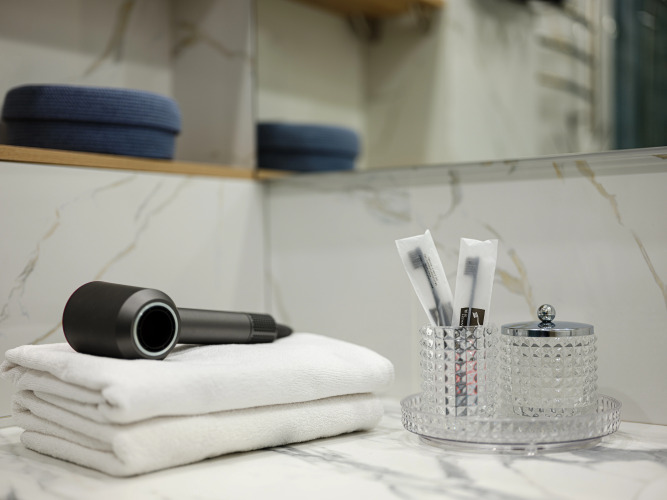 В распоряжении гостей: ортопедические матрасы с независимым блоком пружин карманного типа, постельное бельё и полотенца на количество указанных в бронировании гостей, гигиенические и косметические средства, холодильник с морозильным отделением, электрическая варочная 2-комфорочная панель, электрочайник, микроволновая печь, капсульная кофемашина, смарт-телевизор 55'', тёплые полы, стиральная машина, утюг с гладильной доской, фен, набор посуды и кухонных приборов, фильтр для воды, моющие средства, чай, кофе, сахар, тапочки, зубные наборы, Wi-Fi со скоростью 100 Мб.