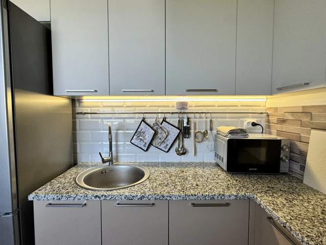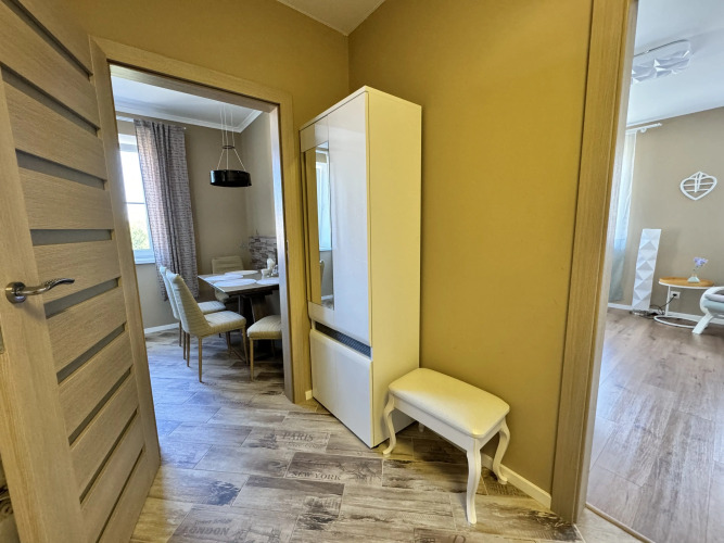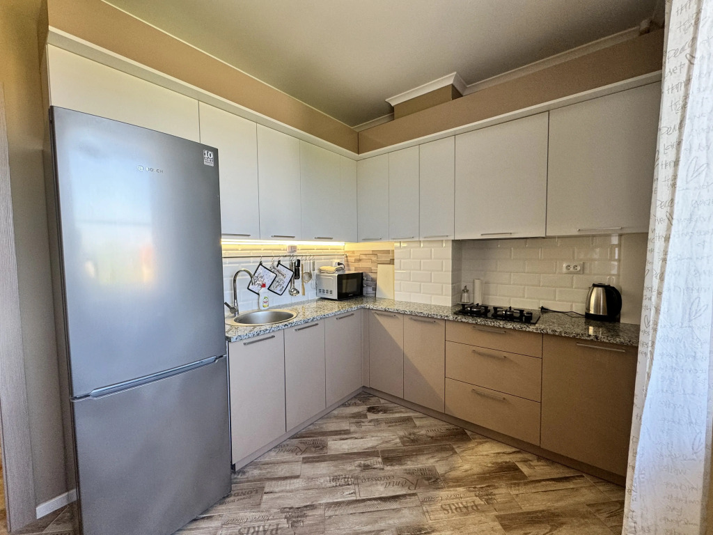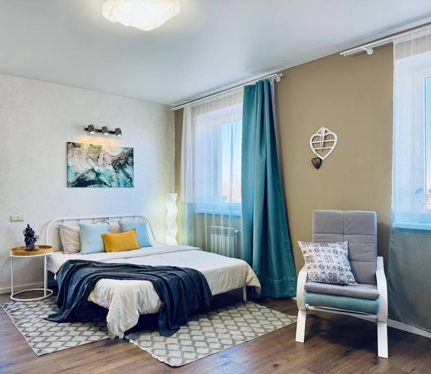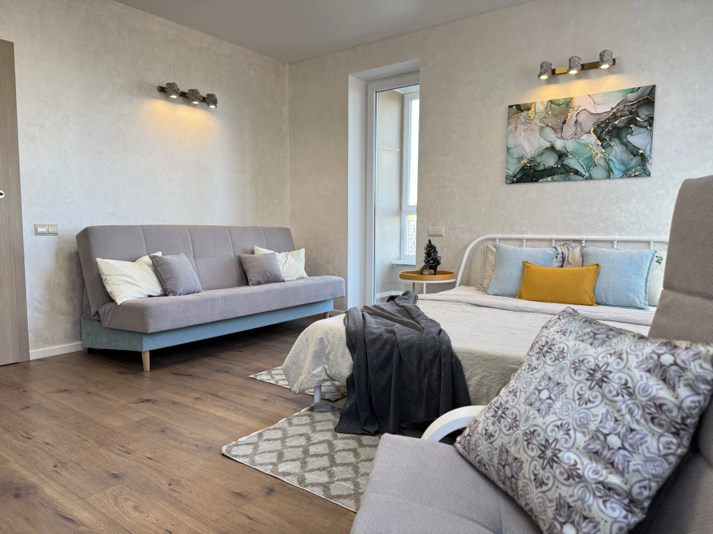 В апартаментах могут разместиться до 4 человек. В распоряжении гостей: двуспальная кровать, раскладной диван, постельное бельё, Smart-TV с доступом в интернет, шторы блэкаут, тёплые полы, ванна с тропическим душем, полотенца, гель для душа, шампунь, фен, стиральная машина, порошок. На кухне есть чайник, газовая плита, микроволновая печь, холодильник, утварь и посуда, высокоскоростной интернет, 2 вместительных шкафа, пылесос, лоджия с креслом-качелью, вид из окна.